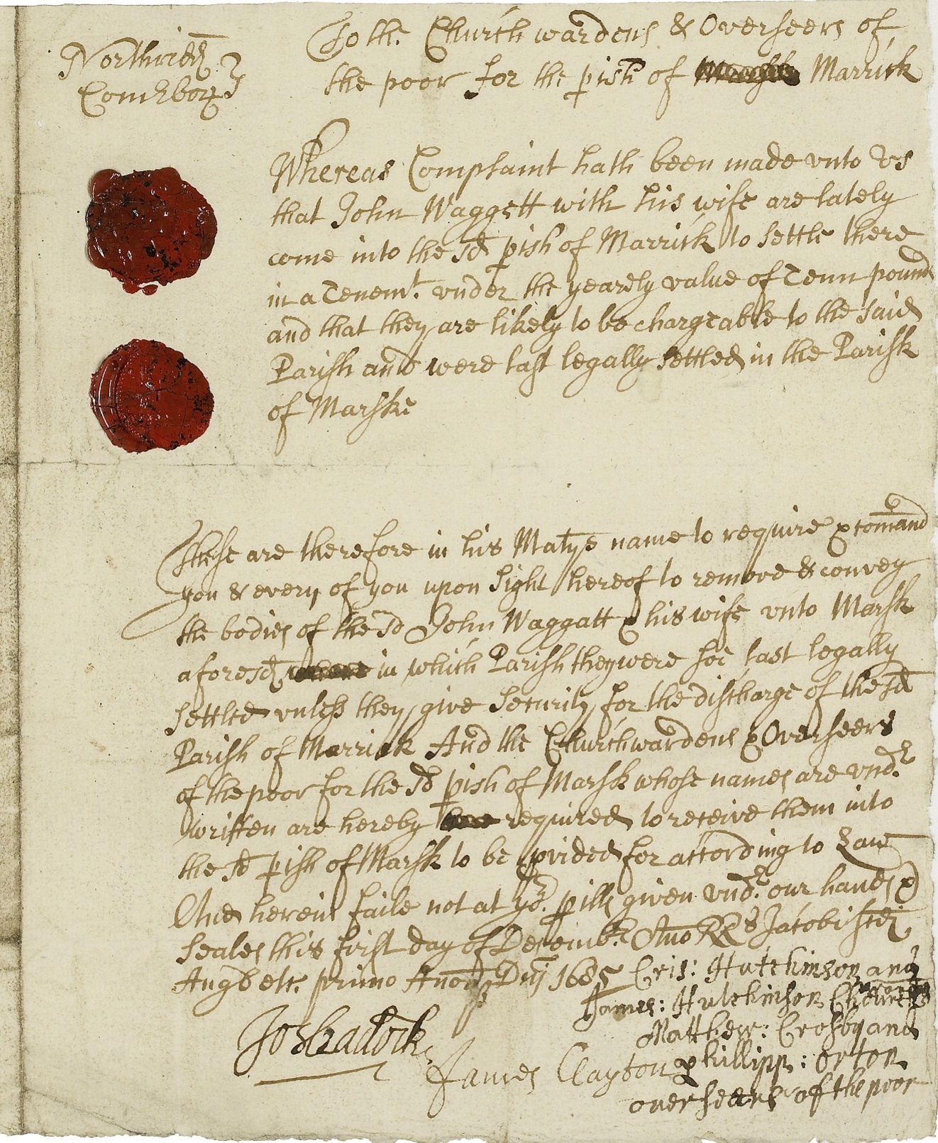 The Justices issued this order to remove John Waggett and his wife from the parish of Marrick to the parish of Marske, where they were last legally settled.