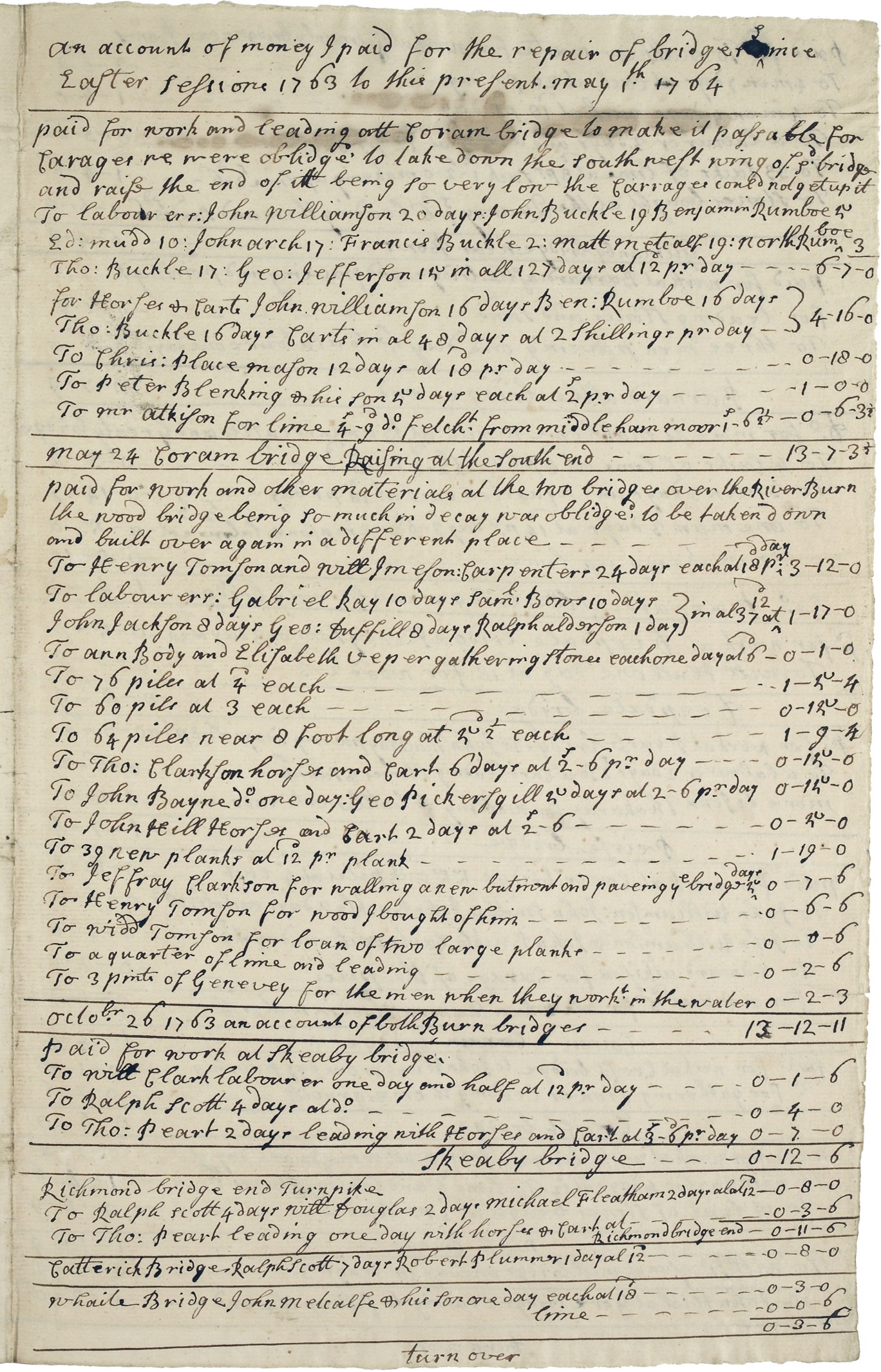 An account of money paid for the repair of bridges, QSB 1764
