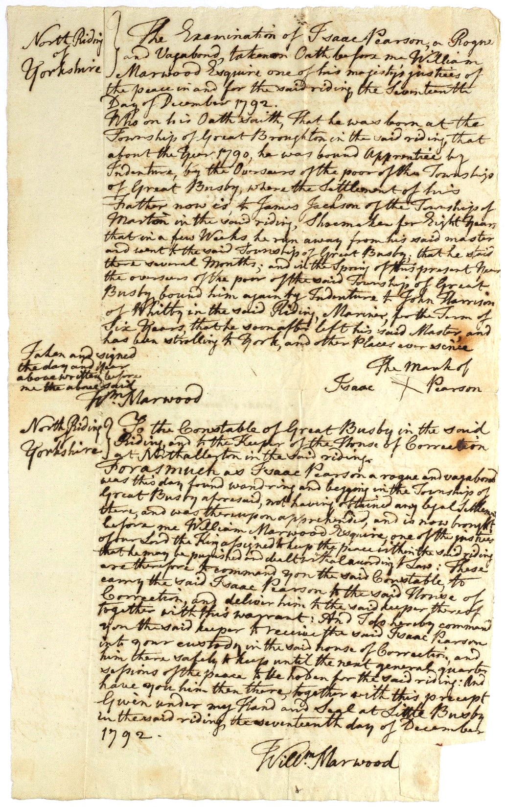 Isaac Pearson was born in Great Broughton. He was bound as an apprentice by the Overseers of the Poor, but ran away to Great Busby. A few months later, the Overseers of the Poor of Great Busby bound him as an apprentice to a mariner in Whitby, but he again left and has been strolling to York and other places, before being apprehended as a rogue and vagabond for wandering and begging in Great Busby. This order requires the Constable of Great Busby to take Isaac to the Northallerton House of Correction to appear at the next Quarter Sessions.