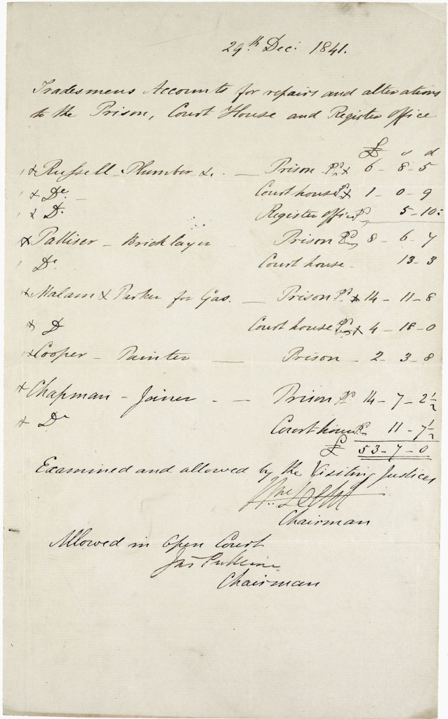This tradesmen’s account shows payment for repairs and alterations made to the Prison, Court House and the Register Office, with money being spent employing a plumber, bricklayer, painter, and joiner, and for the supply of gas.