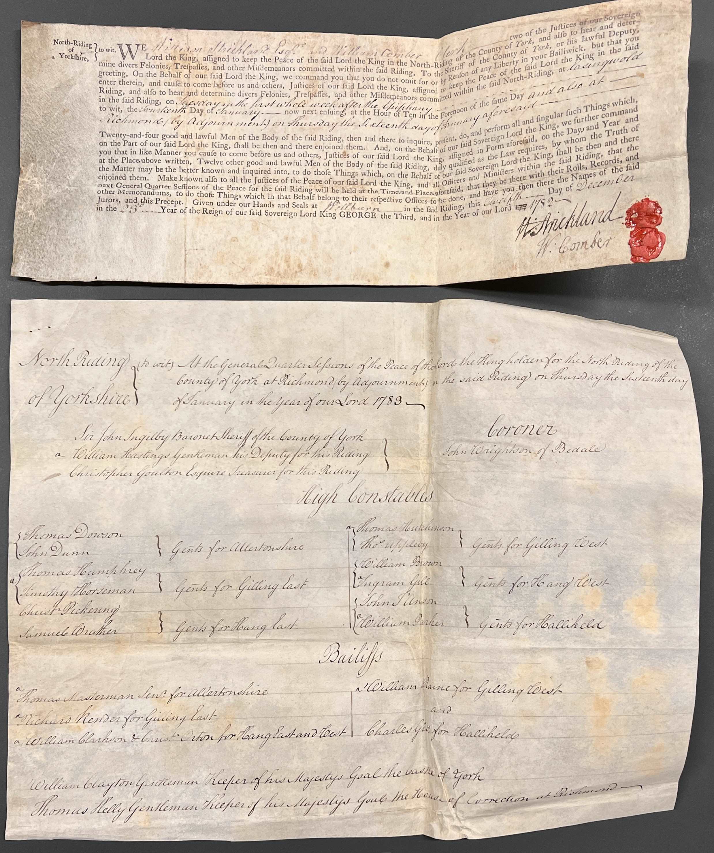 The North Riding Quarter Sessions were presided over by the Justices of the Peace. Other attendees included virtually all of those who held positions of importance in the county, for example the High Sheriff, Deputy Sheriff, the Clerk of the Peace, the County Coroners, Keepers of Houses of Correction or Gaols, Attorneys, Chief Constables, Stewards and Bailiffs. The names of these people were recorded in the call roll for each Sessions, as in the example below (bottom left).