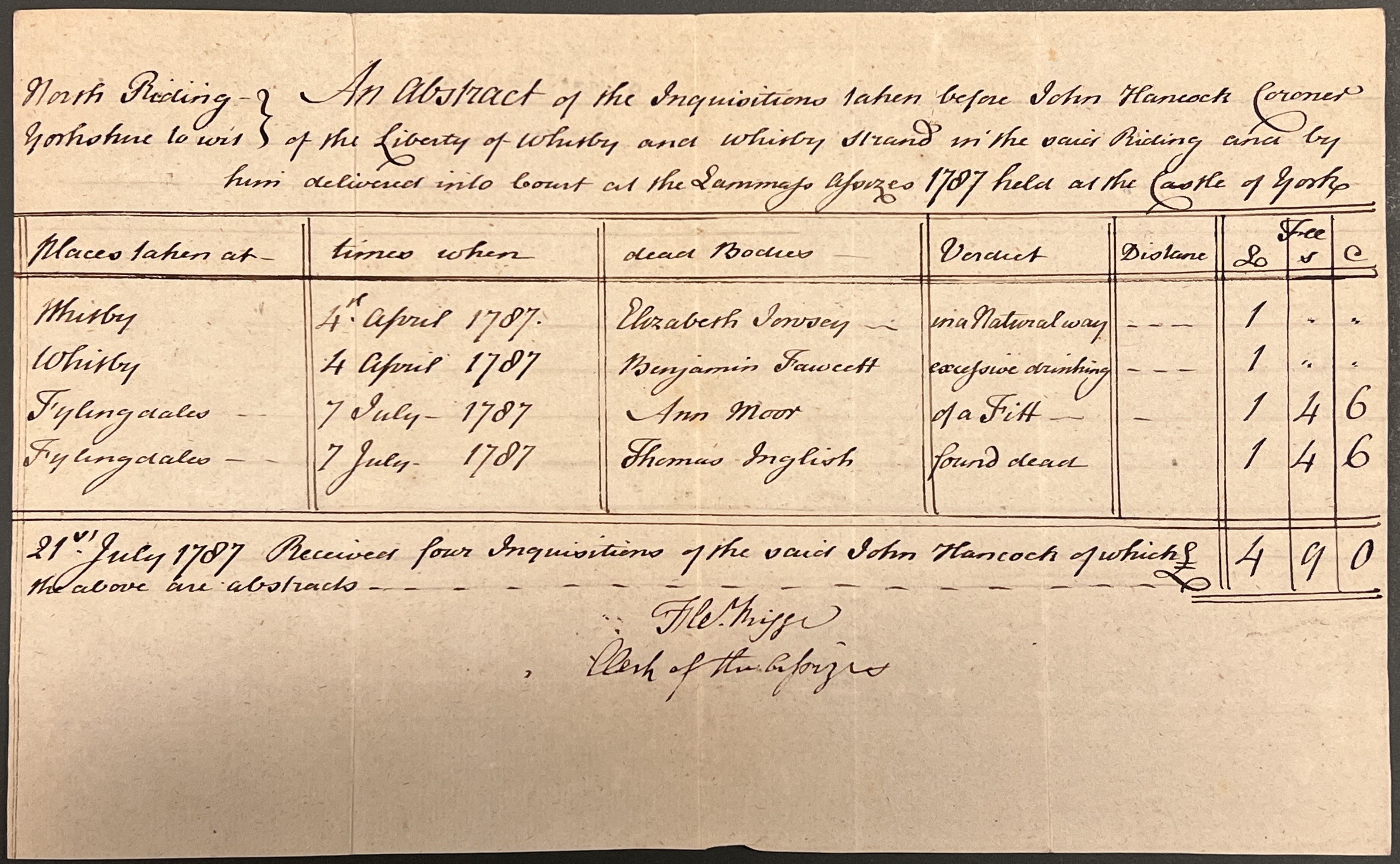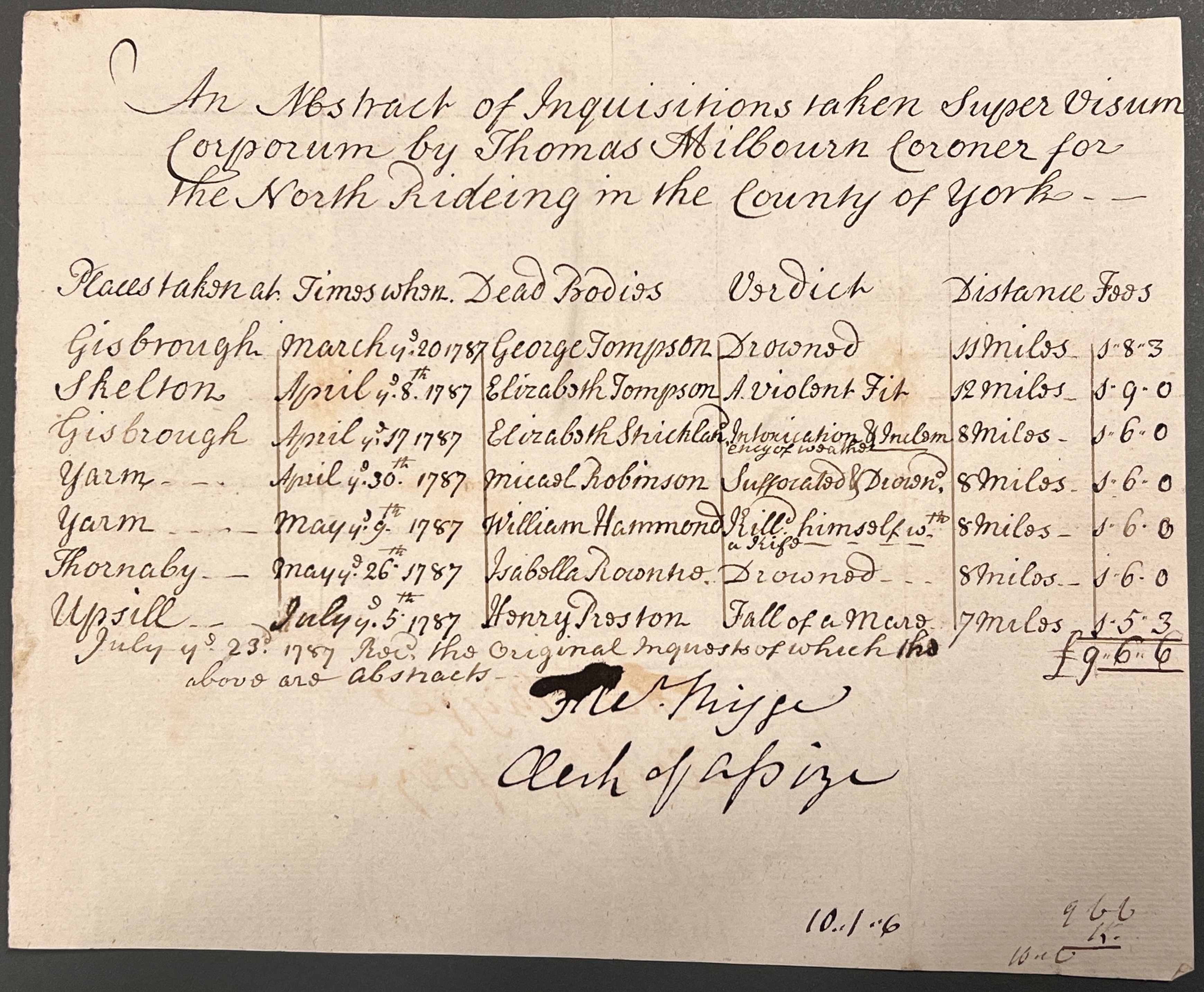 Abstracts of the inquisitions taken before coroners of the North Riding: John Hancock and Thomas Milbourn, recording the locations and dates of the inquests held, names of the deceased and their causes of death, distances travelled by the coroner and his fees, the former delivered into court at the Midsummer Assizes held at the Castle of York, 1787 [QSB 1787 4/16]