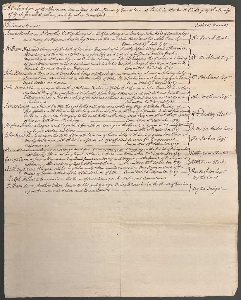 A Calendar of the Prisoners committed to the House of Correction at Thirsk, Michaelmas 1787 [QSB 1787 4/5]
