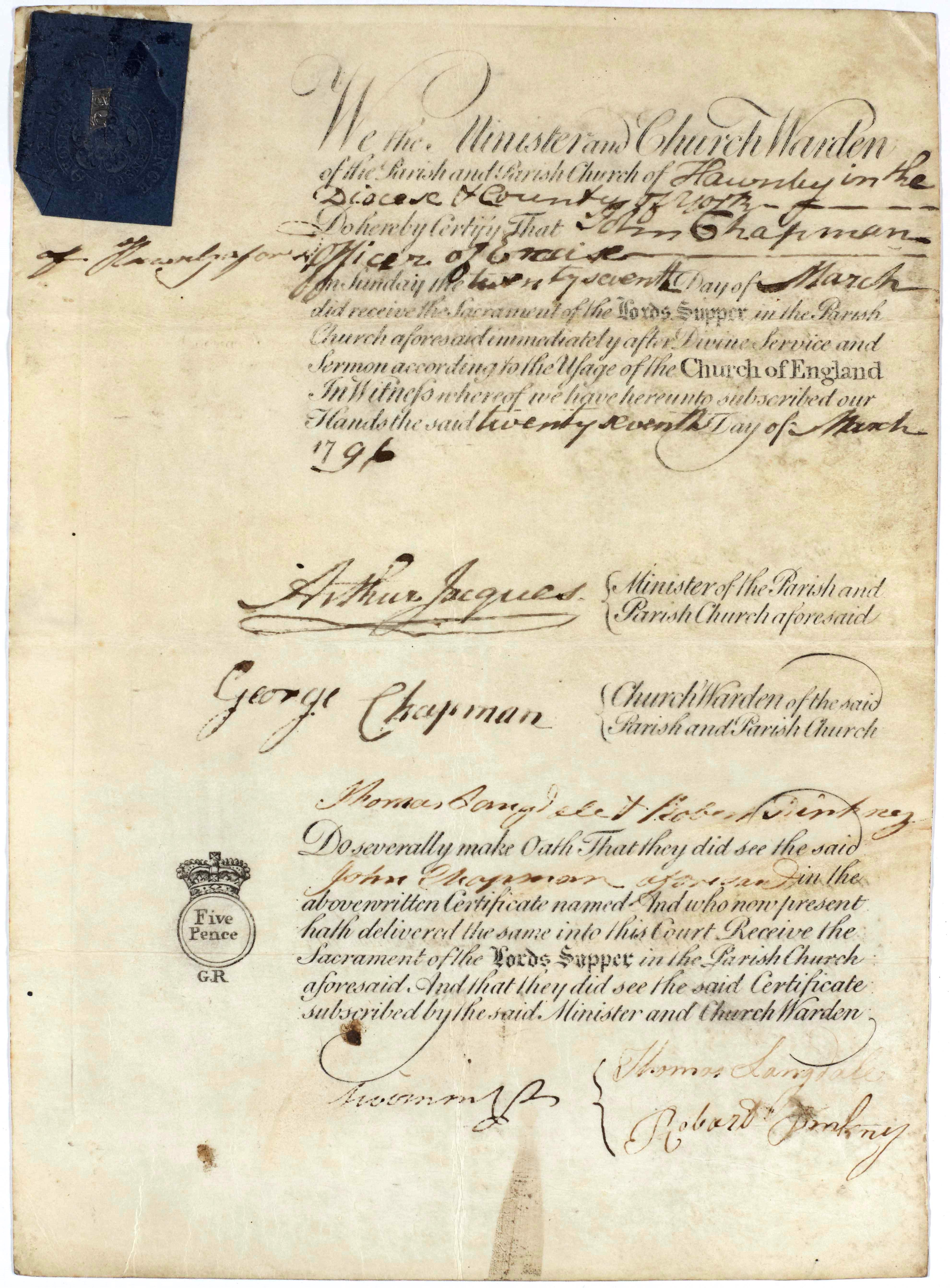This sacrament certificate was signed by Arthur Jacques, minister of Hawnby parish; George Chapman, churchwarden, and two witnesses.