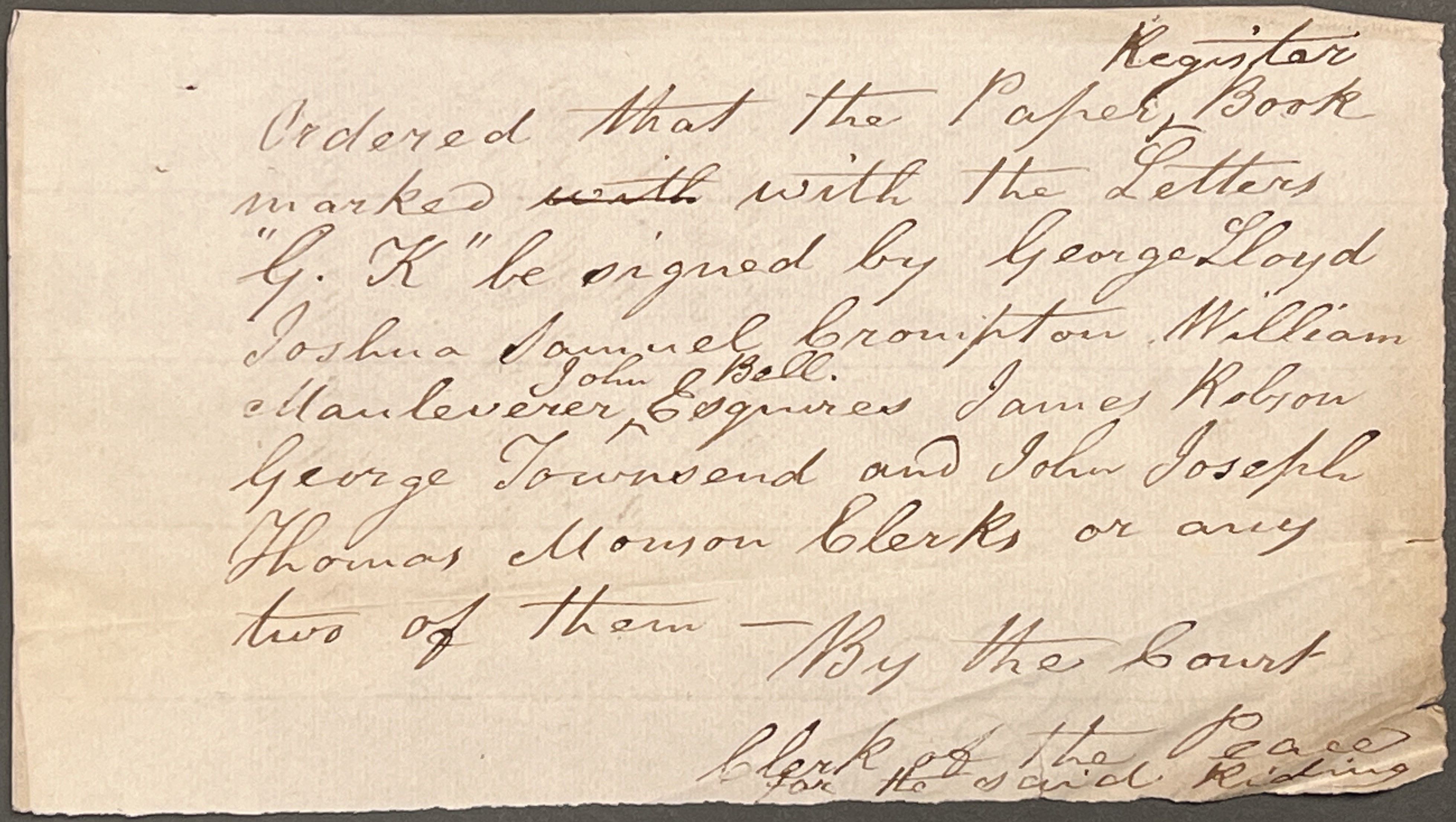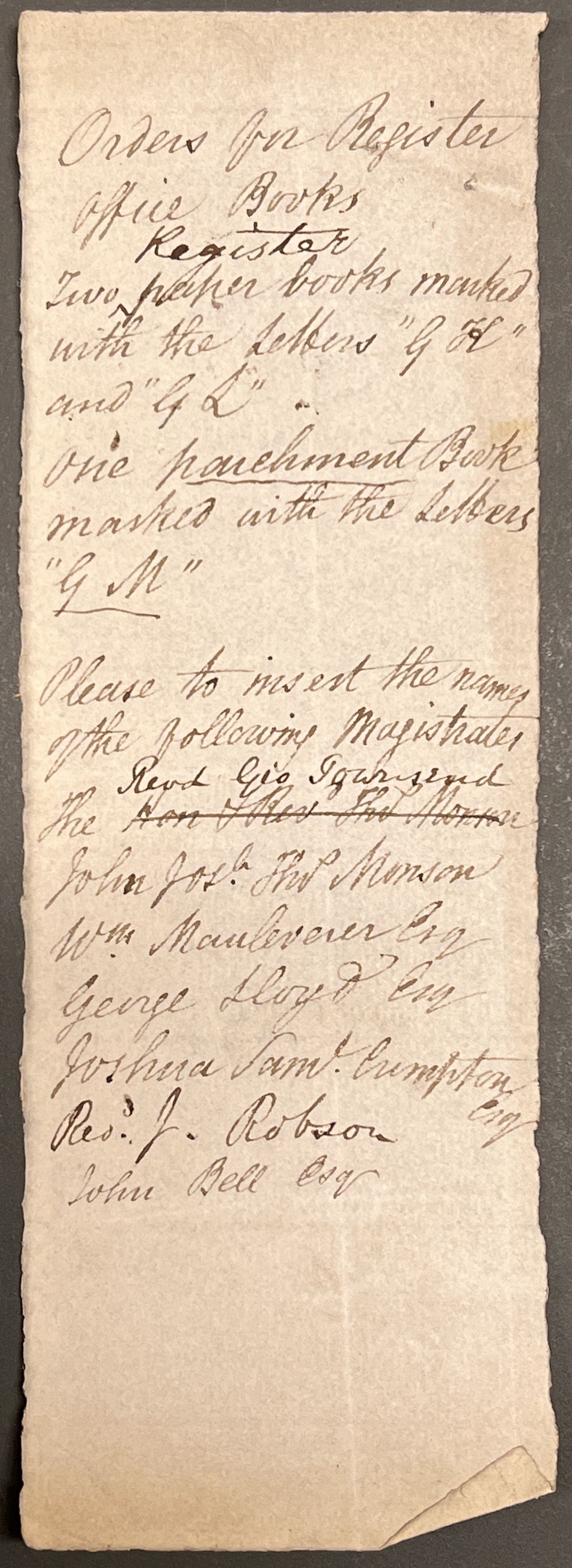 Order for books for the North Riding Registry of Deeds: two paper books to be marked with the letters ‘GK’ and ‘GL’, and one parchment book to be marked ‘GM’ [QSB 1836 4/14]
