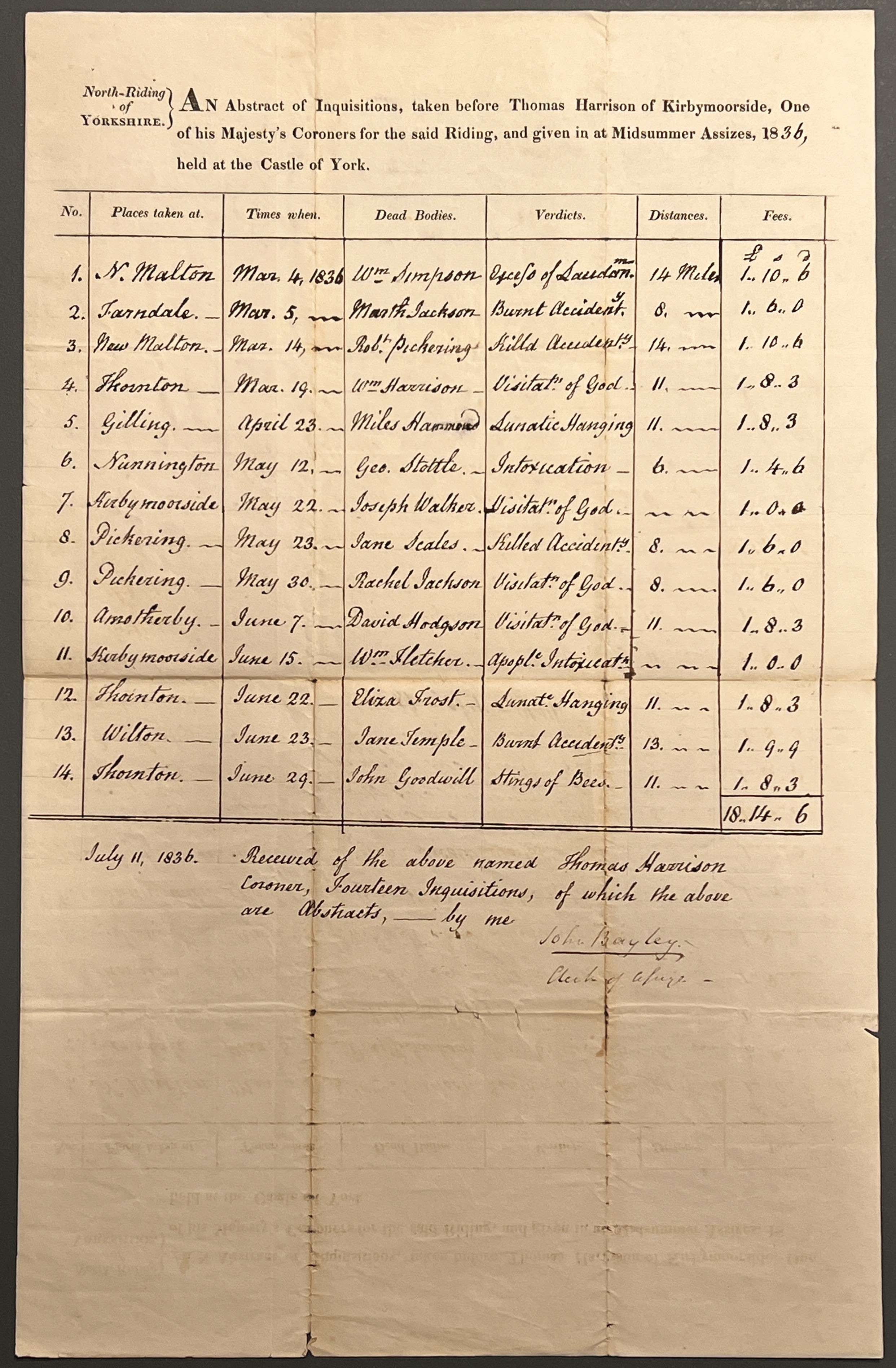 Abstract of the inquisitions taken before coroner Thomas Harrison of Kirkbymoorside, recording the locations and dates of the inquests held, names of the deceased and their causes of death, distances travelled by the coroner and his fees, given to the Midsummer Assizes held at the Castle of York, 1836 [QSB 1836 4/16]