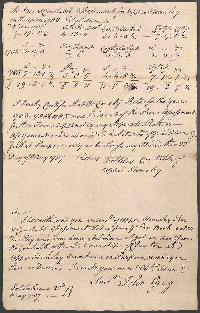 Left: Return of the Constables of Sheriff Hutton for the year 1782 following their inspection of the growing of tobacco, 14 January 1783 [QSB 1783 1/12] & Right: The Poor and Constable Assessment for Upper Helmsley, 1783-1787, recorded by Robert Halliley, Constable of Upper Helmsley, & submitted by John Gray, 22 May 1787 [QSB 1787 4/12]