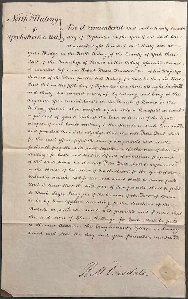 In one of the above examples, Peter Dent, a farmer from Bowes, is convicted for trespassing upon lands occupied by Adam Bousfield on 5 September 1836 in search of game without permission. He is ordered by Robert Dinsdale, J.P. to forfeit the sum of £2 to be paid to the Overseer of the Poor of Bowes, and 11 shillings in costs to be paid to the complainant, Thomas Alderson, or be imprisoned in the House of Correction at Northallerton for two months.