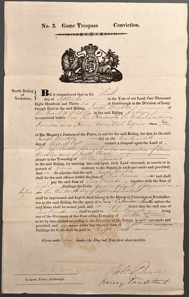 In the other example, Joseph Buckton, a labourer from Wilton, is also convicted of trespass in search of game, and similarly ordered to pay £2 to the Overseer of the Poor of Wilton, and 8 shillings in costs. In default of payment on or before 13 September, he is to be imprisoned and kept to hard labour at the House of Correction at Northallerton for two months.