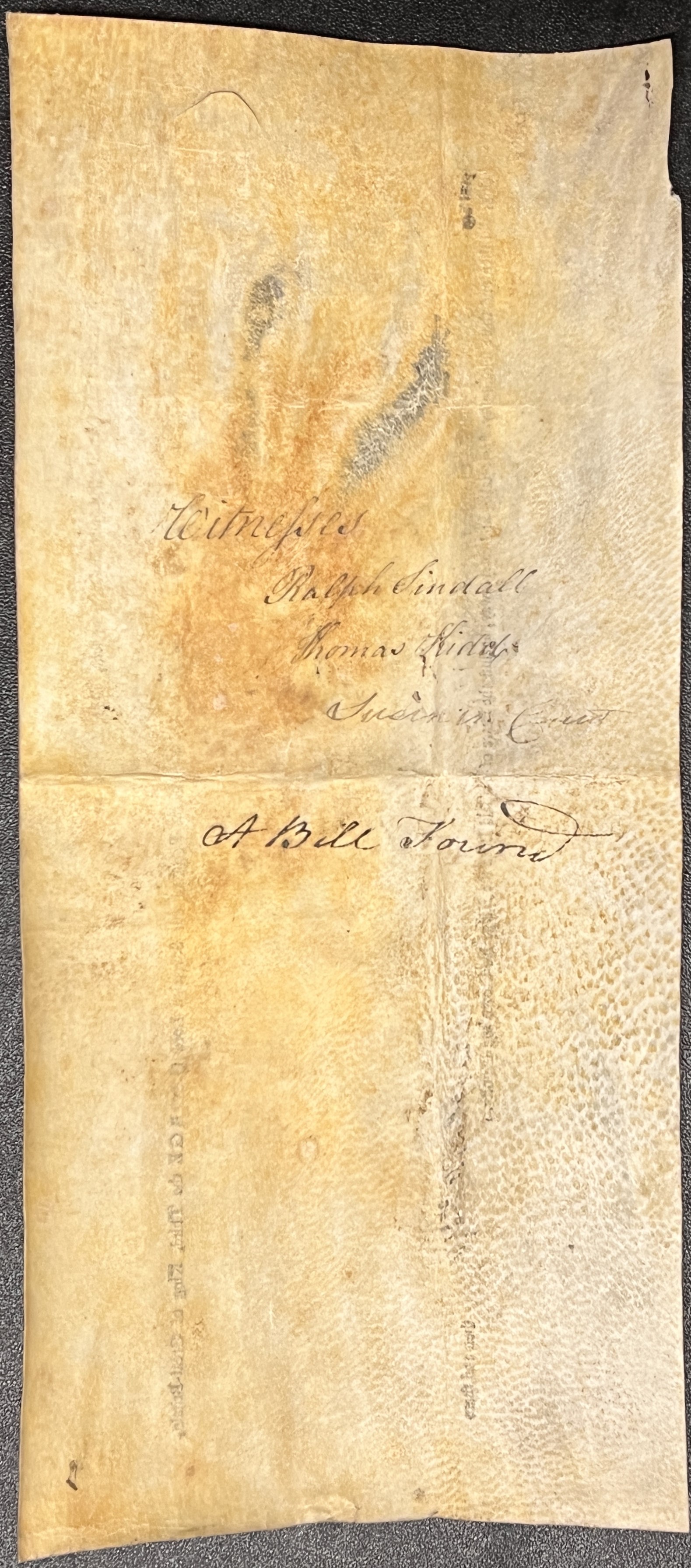 Presentments and bills of indictment are documents which outline an offence alleged to have been committed by a person or group of people. They were written on strips of parchment and endorsed on the back with the names of the witnesses who were to be examined before the Grand Jury. The Grand Jury would hear evidence for the prosecution only, and would decide whether the case was sufficiently well founded to send the accused for trial (known as a ‘true bill’). The examples below are endorsed (written on the back) with the words “True bill” or “Not found” (sometimes “Not true bill”), according to whether or not they were passed on to the Traverse Jury for a full hearing.