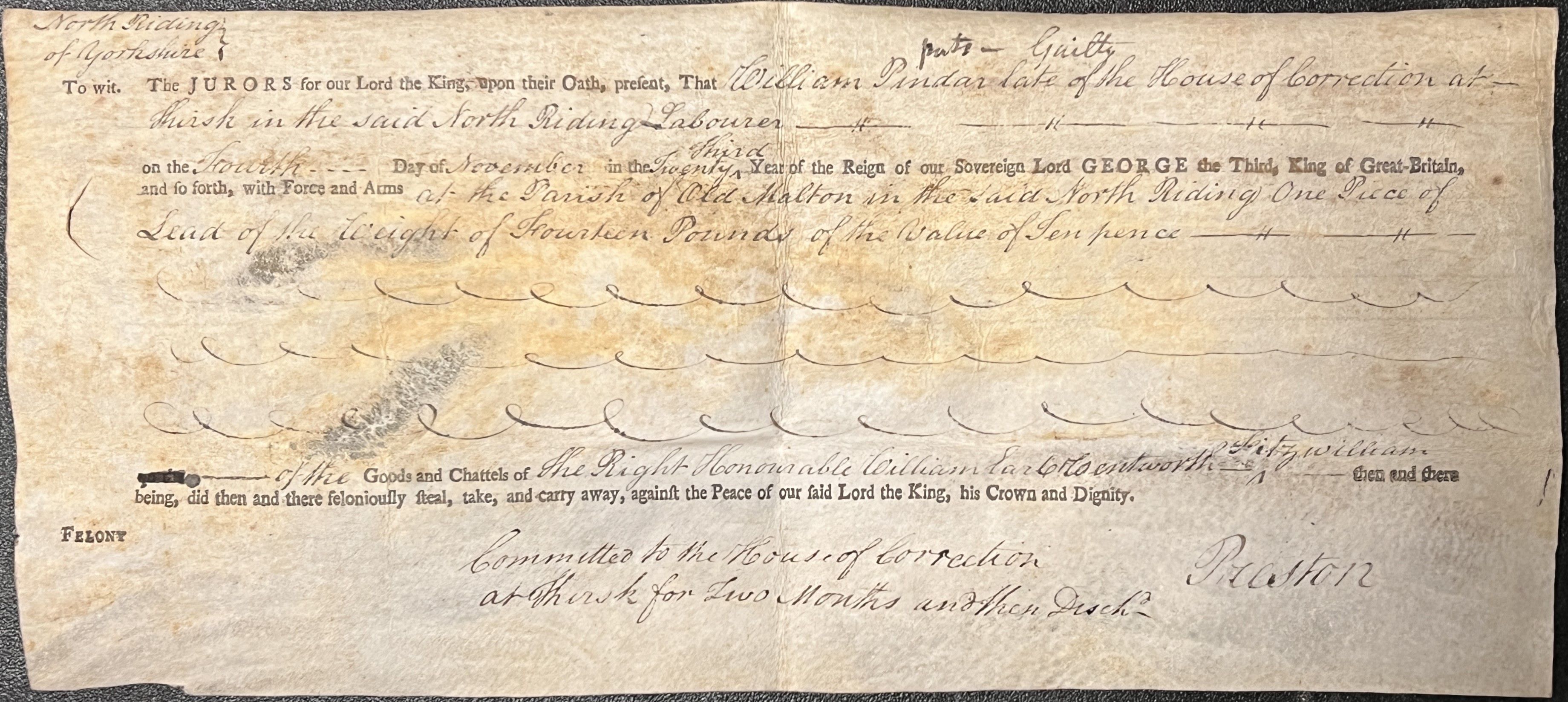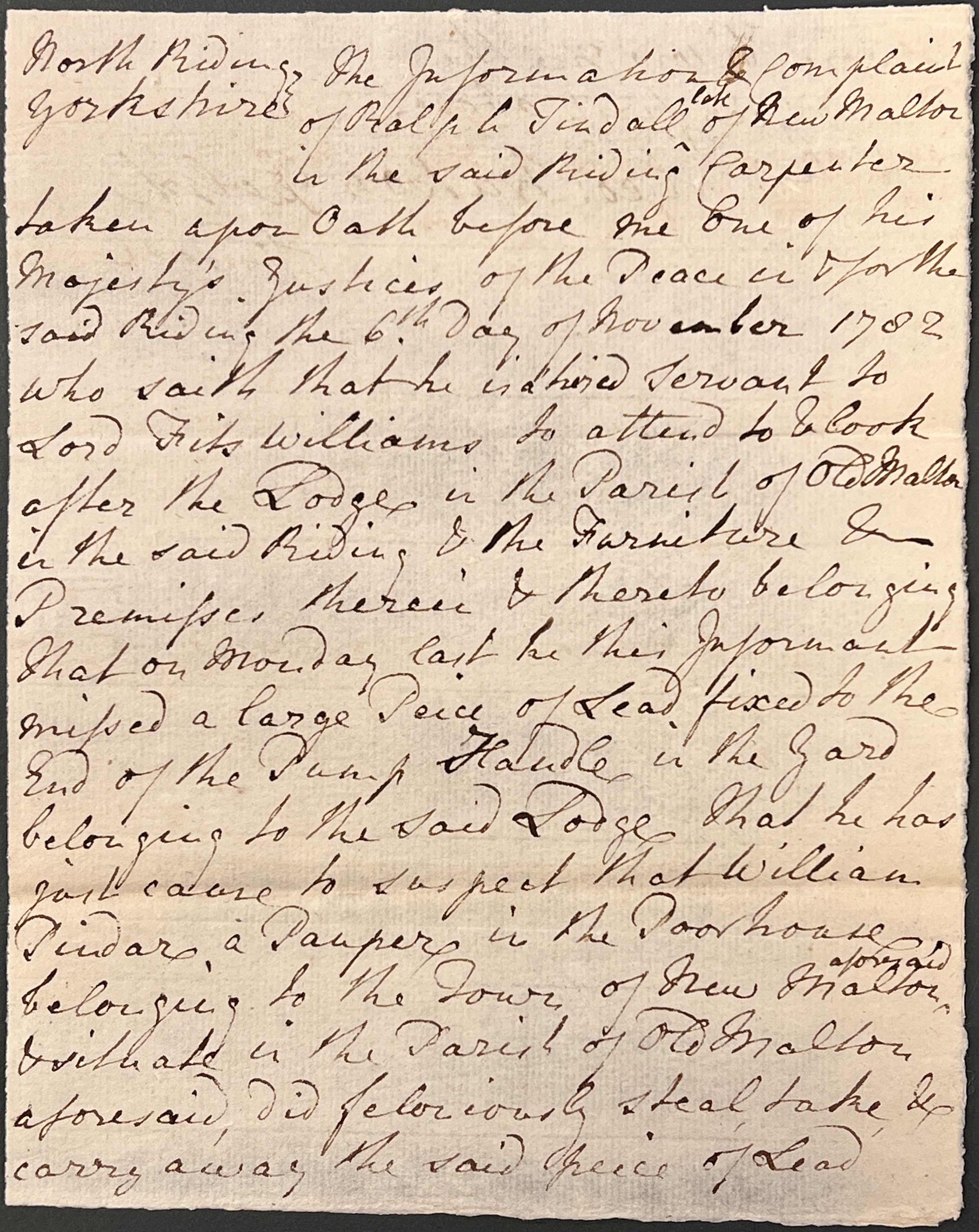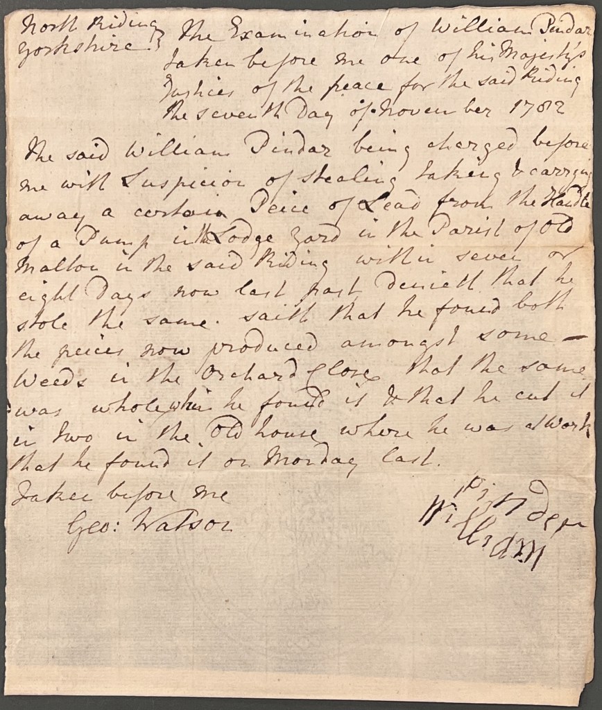 The above document records the accusation – in the information and complaint of 6 November 1782, Ralph Tindall, a carpenter, upon oath before the Justice of the Peace, says that he is a hired servant to Lord Fitzwilliam, to look after the Lodge in Old Malton and its associated furniture and premises. He noticed a large piece of lead was missing that had been fixed to the end of the pump handle in the yard of the Lodge. He has just cause to suspect that William Pindar, a pauper in the poorhouse belonging to the town of New Malton, ‘did feloniously steal, take, & carry away the said piece of lead’.