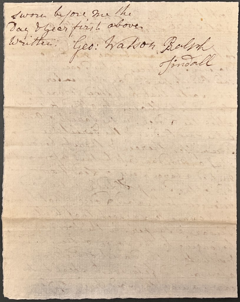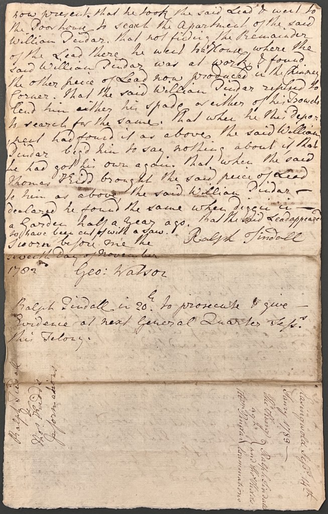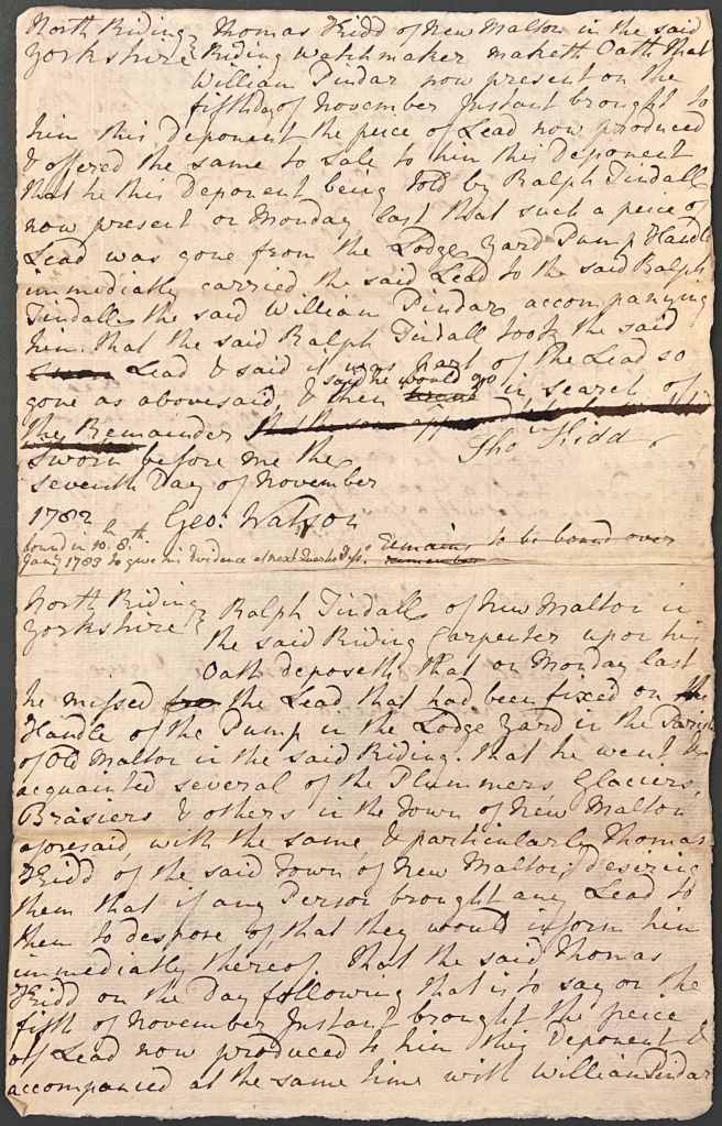 The above document records the sworn statements of both Thomas Kidd and Ralph Tindall – in the first part of the deposition of 7 November 1782, Thomas Kidd, a watchmaker of New Malton, makes the oath that on 5 November, William Pindar offered to sell a piece of lead to him. Having been told by Ralph Tindall that such a piece of lead was missing from the Lodge yard pump handle, Thomas Kidd immediately took the lead to Ralph Tindall, accompanied by William Pindar. Ralph Tindall said that it was part of the lead that was missing and that he would go in search of the remainder.