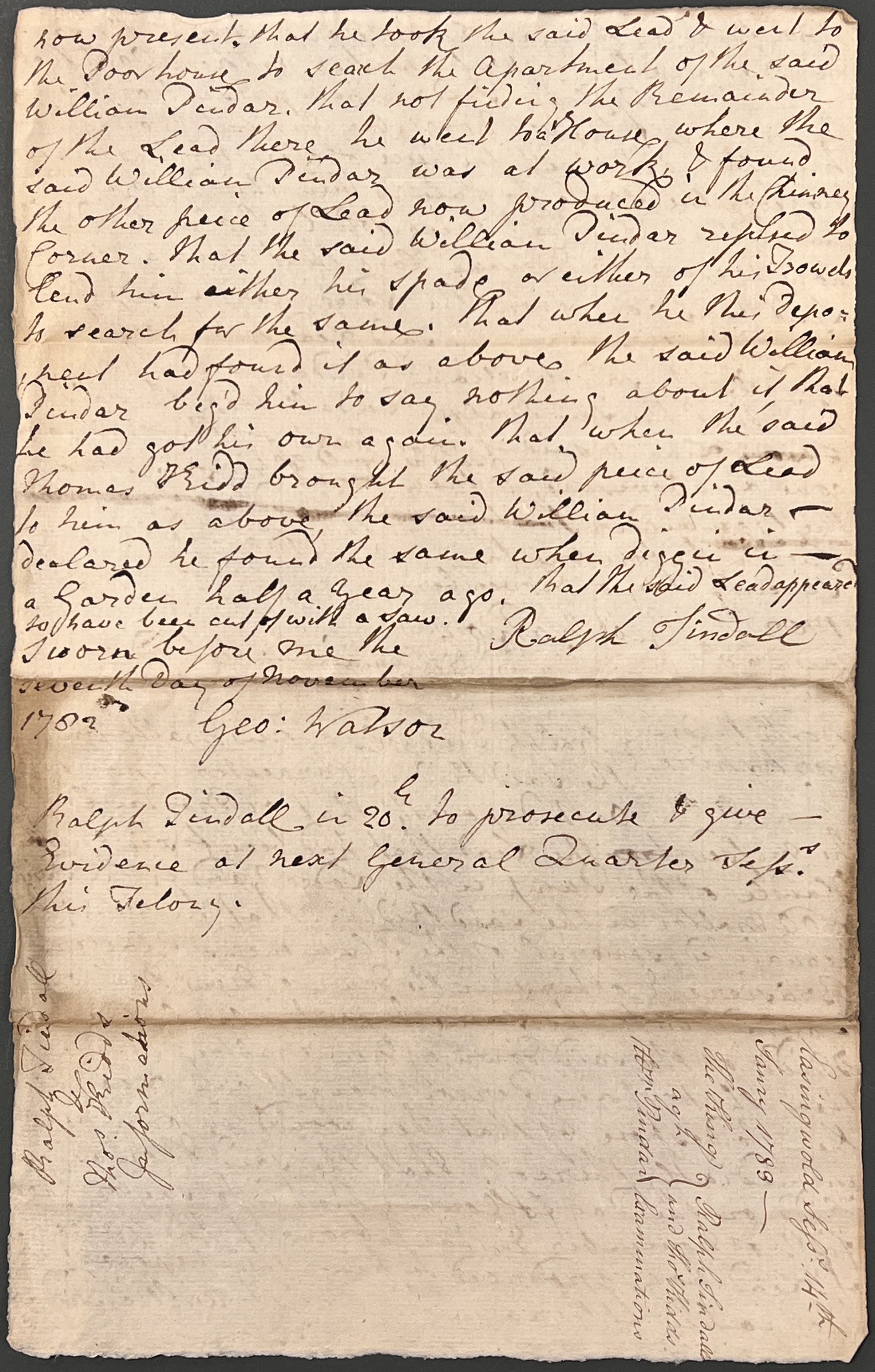 In the second part of the deposition, Ralph Tindall says under oath that after he noticed the lead that had been fixed on the handle of the pump in the Lodge yard was missing, he notified the plumbers, glaziers, brasiers and others in the town, and particularly Thomas Kidd. He asked them that they notify him immediately if anyone brought them any lead to dispose of. On 5 November, Thomas Kidd brought the piece of lead to him, accompanied by William Pindar. Ralph Tindall took the lead, and went to the poorhouse to search the apartment of William Pindar, but not finding the remainder of the lead there, he went to a house where William Pindar was at work and found the other piece of lead in the chimney corner. William Pindar had refused to lend Ralph Tindall his spade or either of his trowels to search for the lead, and begged him to say nothing about it. When Thomas Kidd brought the piece of lead to Ralph Tindall, William Pindar declared that he had found it when digging in a garden half a year ago. The lead appeared to have been cut off with a saw.
