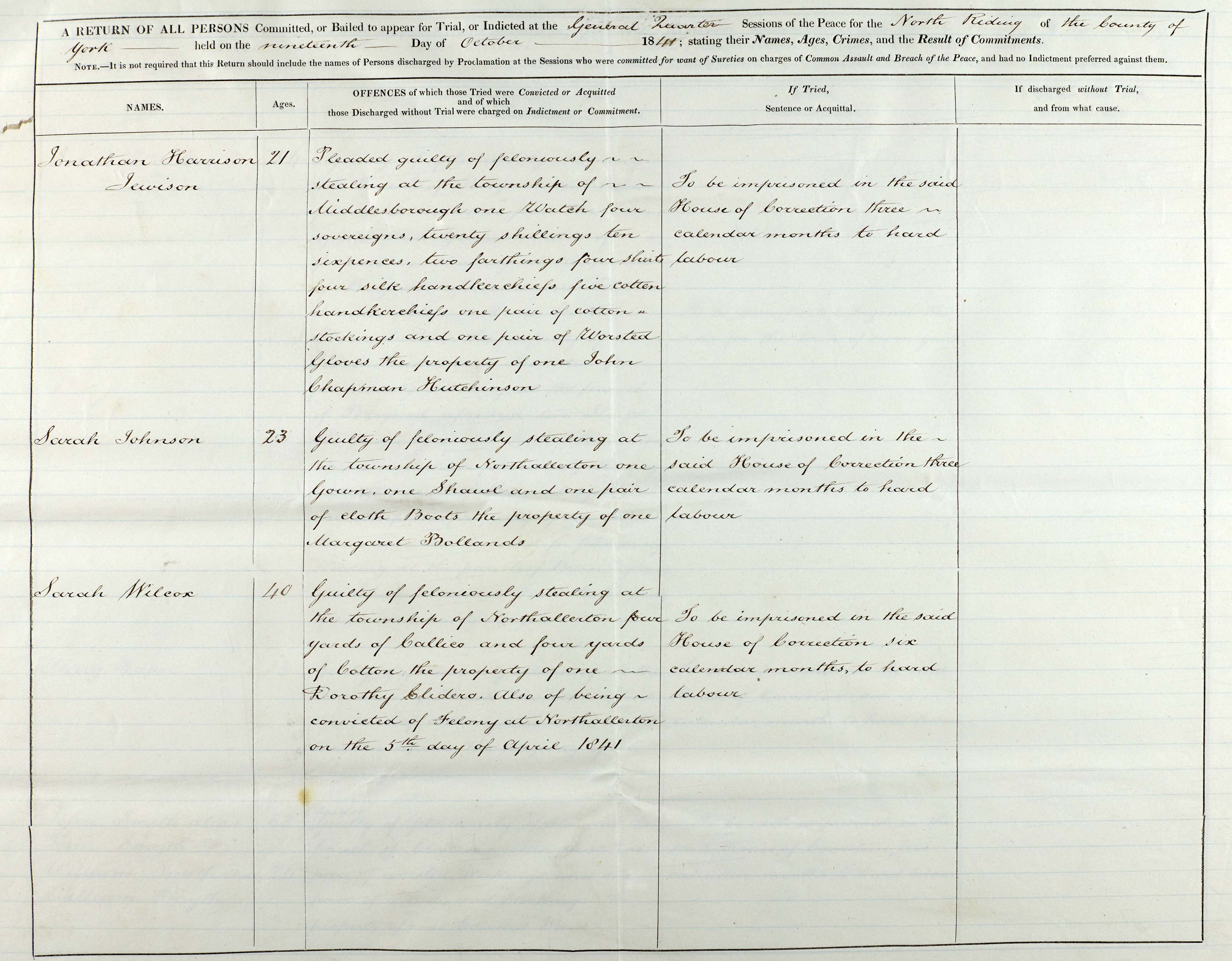 The above return records the person’s name, age, offence for which they were convicted and their sentence. All three were found guilty of theft and were sentenced to either three or six months of hard labour at the House of Correction in Northallerton.