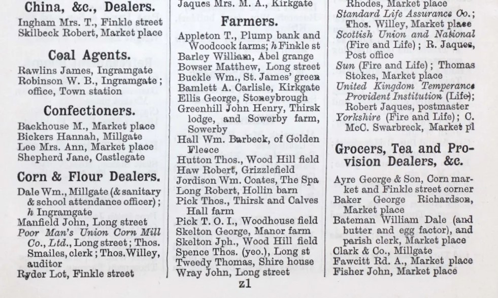 Extract from Bulmer’s History and Directory of North Yorkshire 1890, showing a list of farmers in Thirsk