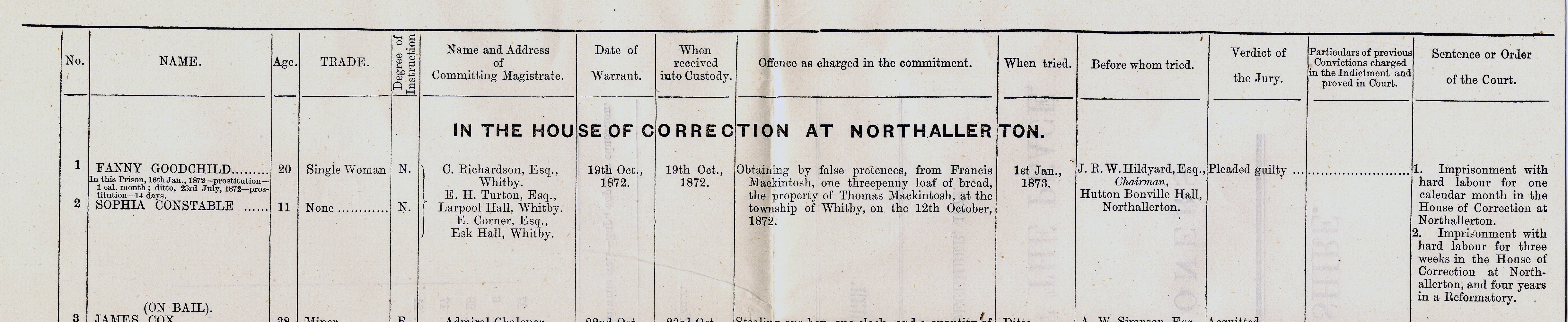 Sophia was sentenced to three weeks of hard labour at Northallerton Gaol, to be followed by 4 years at a Reformatory School.
