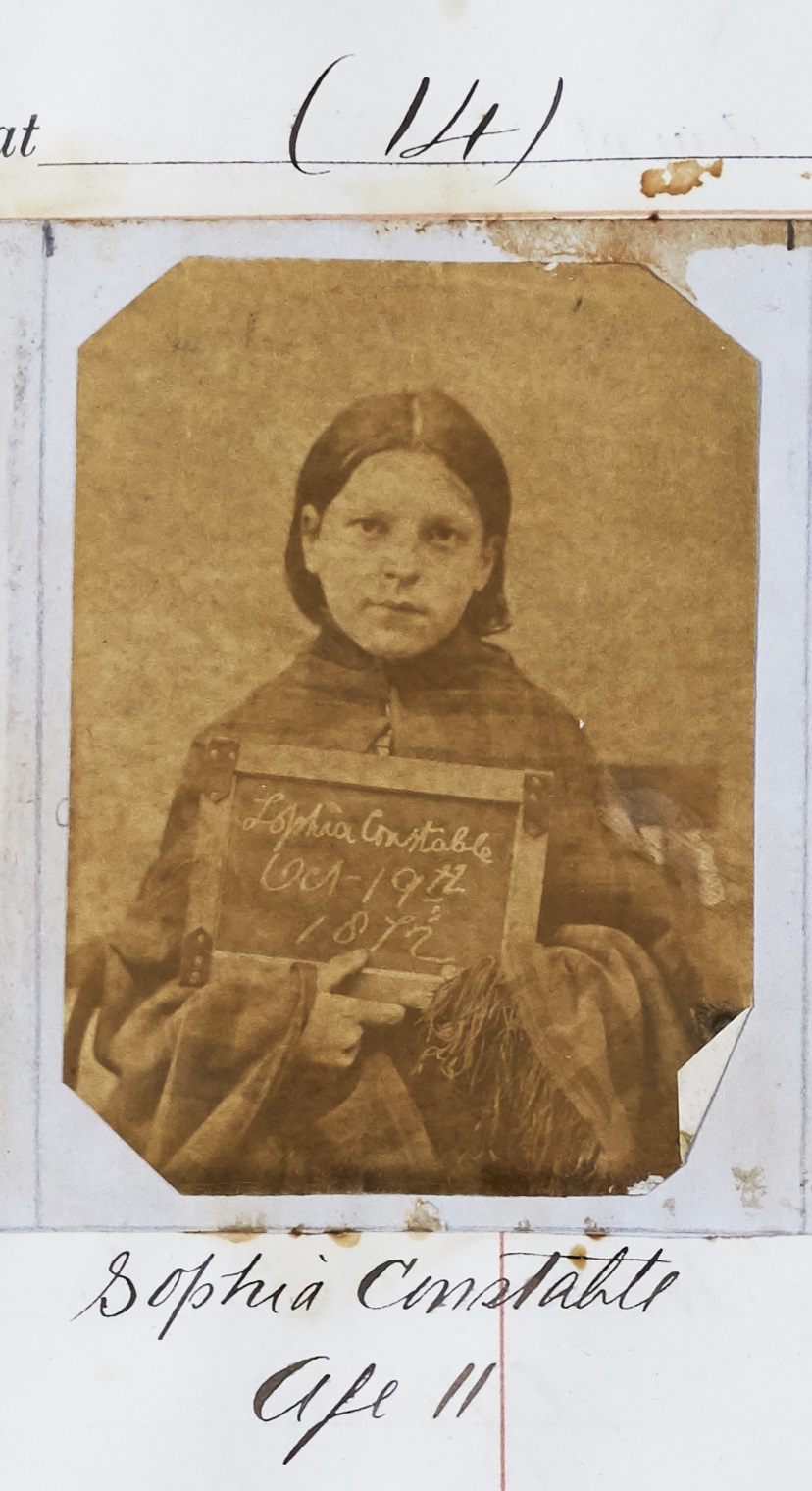 Photograph of Sophia Constable, age 11, in the Police charge book, 19 October 1872 [QP]