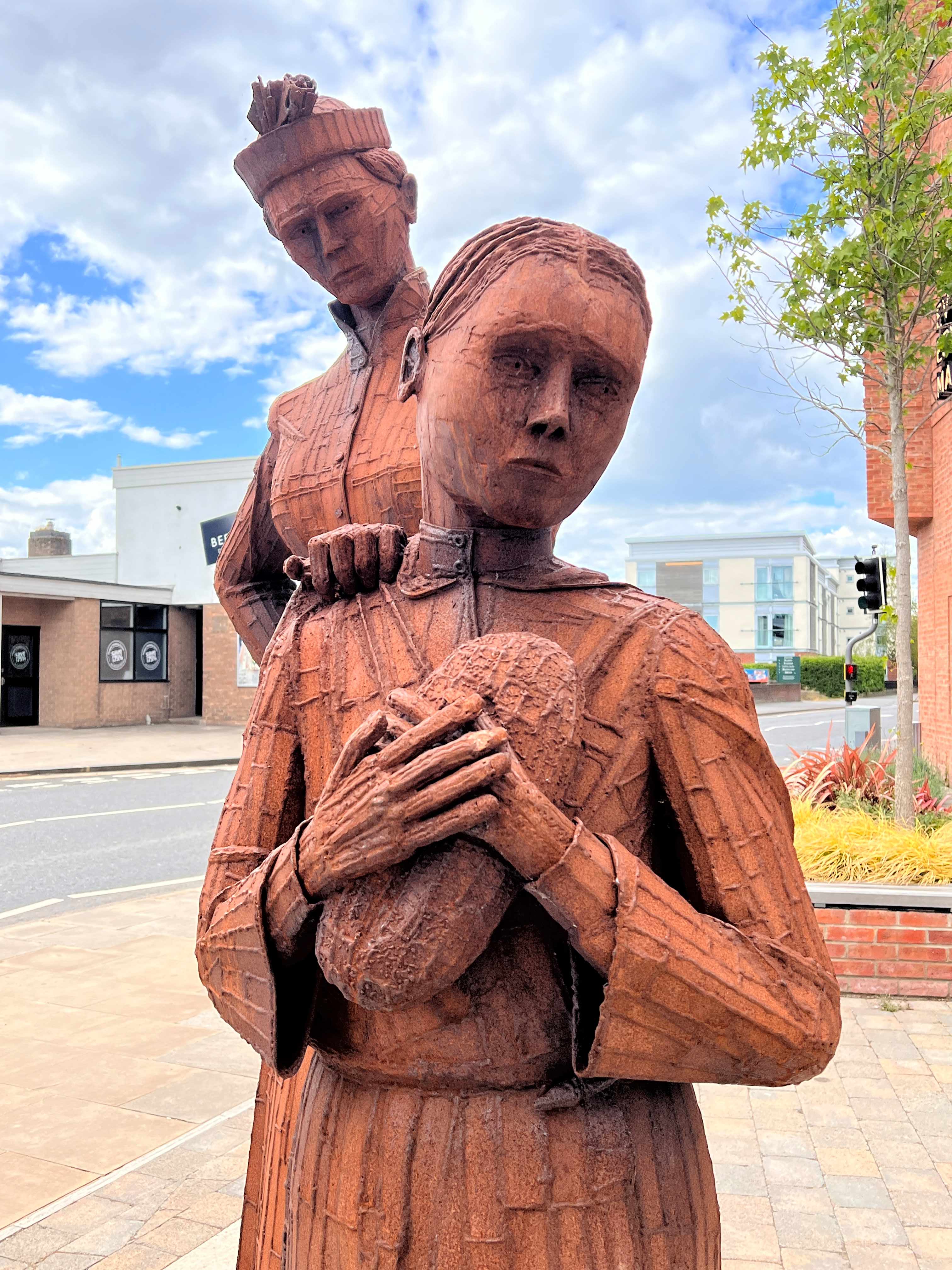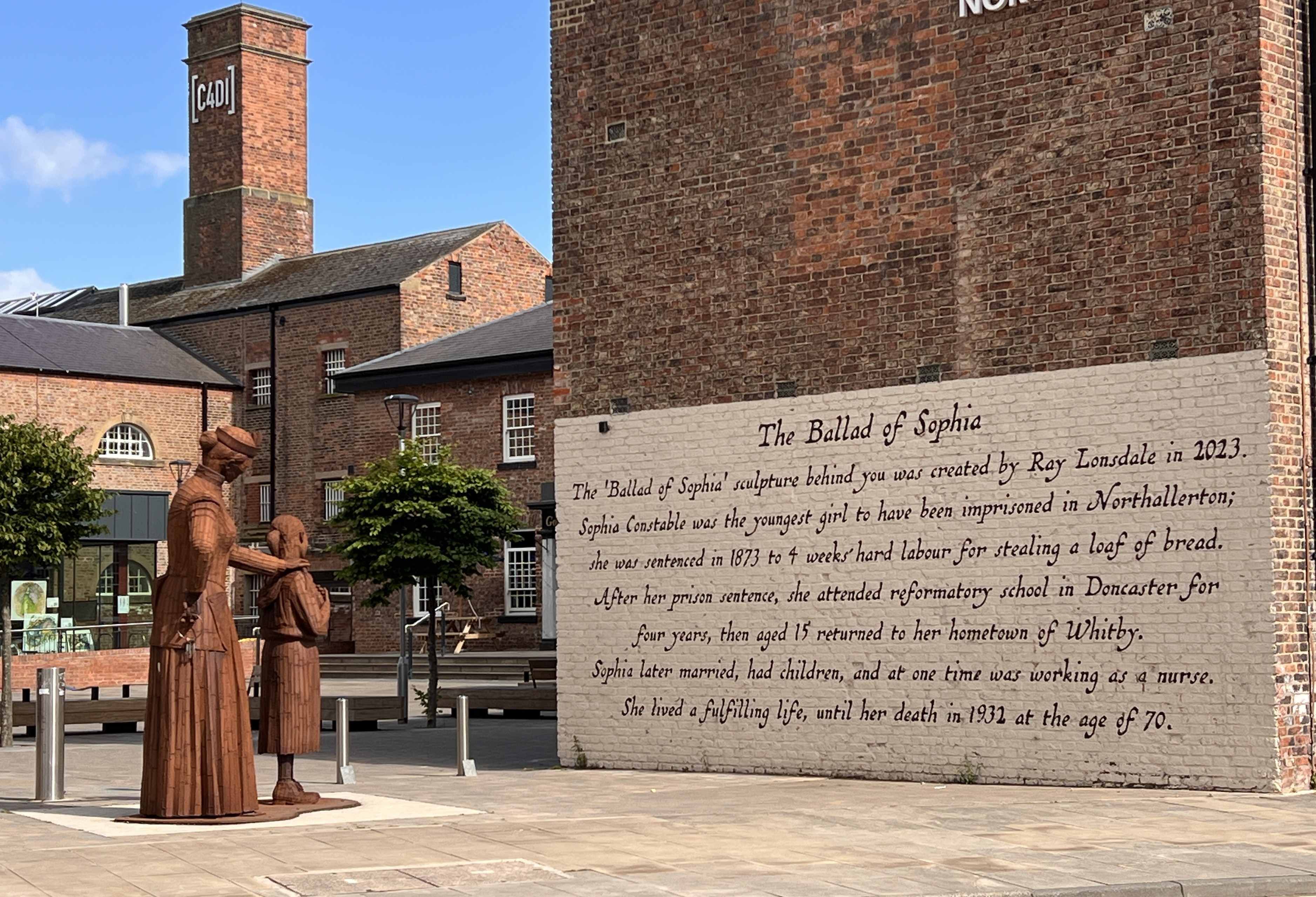 Ray Lonsdale’s 2023 steel sculpture ‘The Ballad of Sophia Constable’, commissioned for the new Treadmills Development on the site of the former Northallerton Prison, East Road, Northallerton. The sculpture depicts Sophia clutching a loaf of bread, with a prison warden placing a hand on her shoulder [photographs by Gail Falkingham, May 2025]