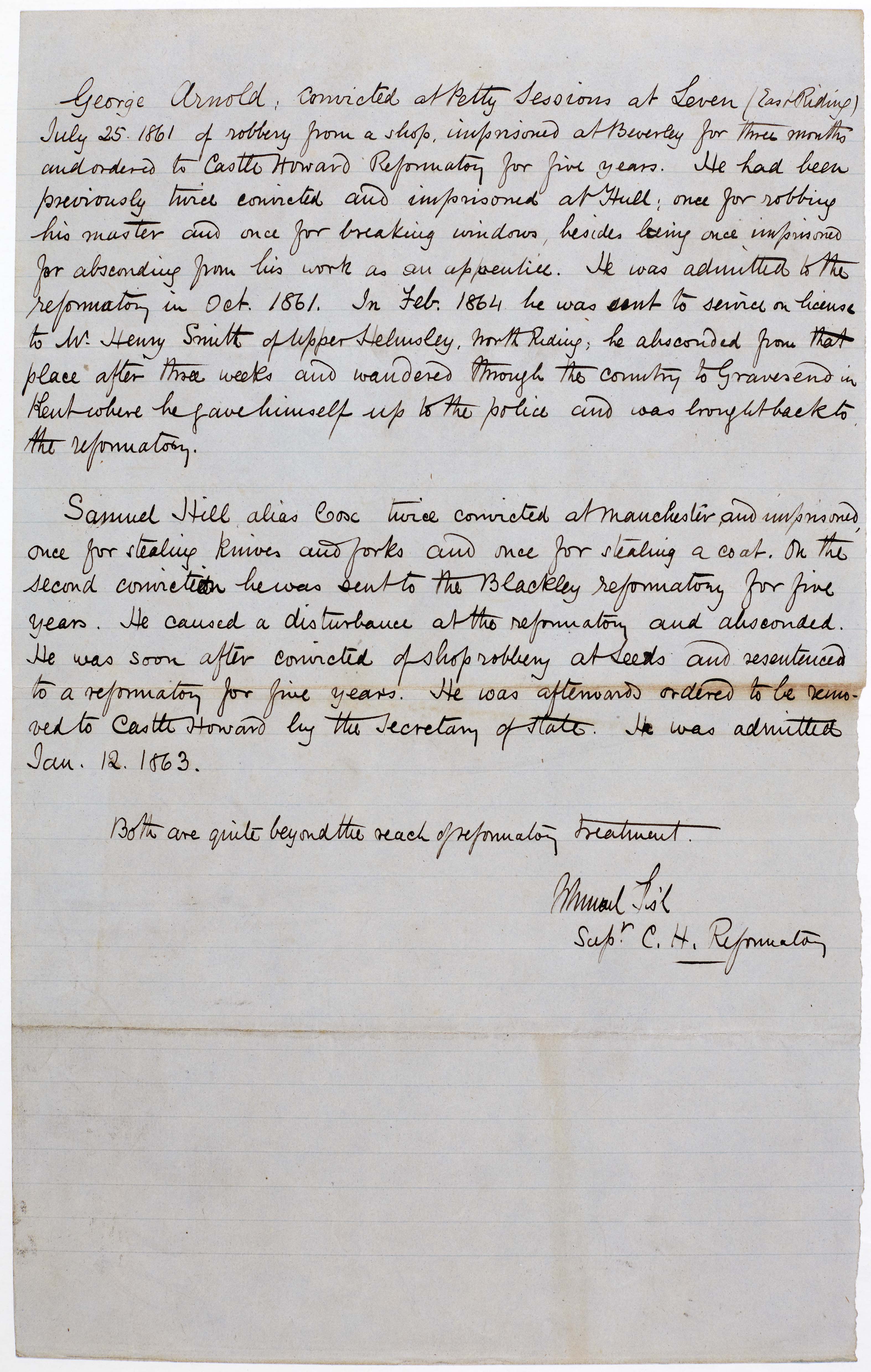 Further still, many of the records we hold that mention the Castle Howard Boys’ Reformatory School, are reconviction records for its inmates. One example: George Arnold and Samuel Hill alias Cox. Both had multiple previous convictions and had caused disturbances at Reformatory Schools before Ishmael Fish, superintendent of Castle Howard Boys’ Reformatory School, declared them beyond the reach of reformatory treatment.