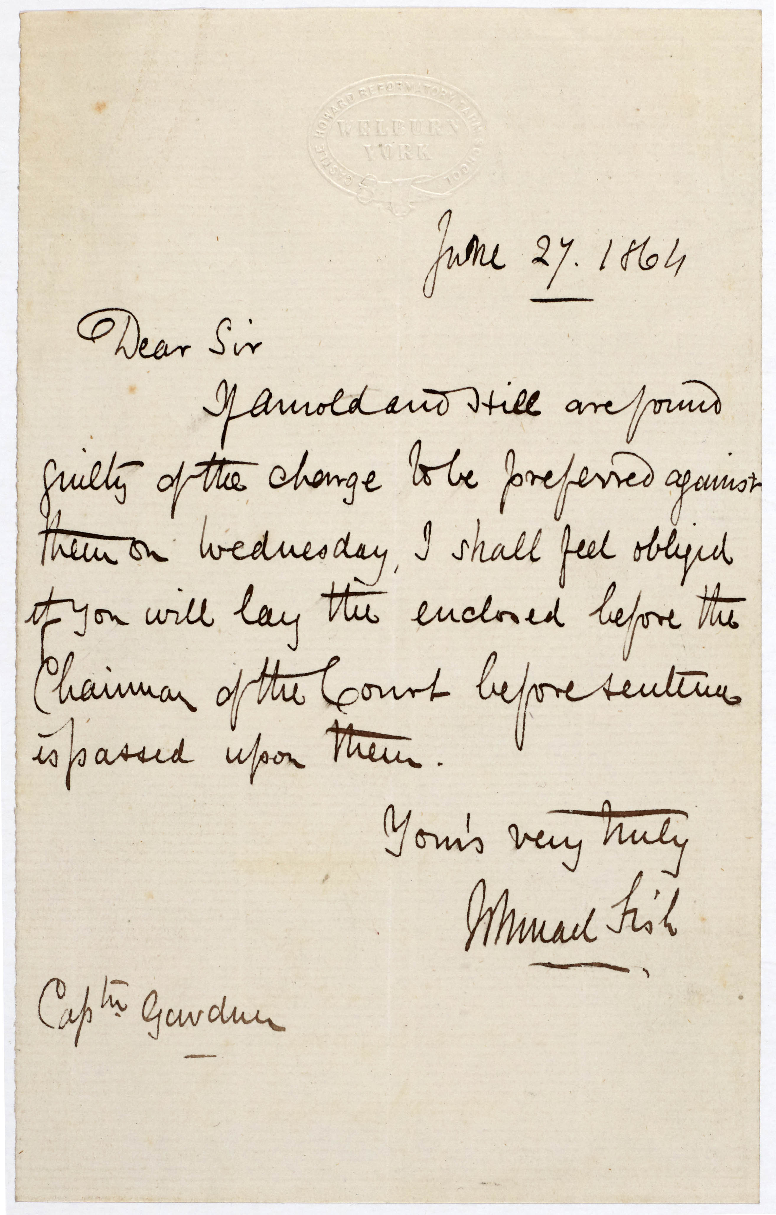 Notes on the previous convictions and misbehaviour of George Arnold and Samuel Hill alias Cox, inmates at the Castle Howard Reformatory – both are considered quite beyond the reach of reformatory treatment (left) & covering letter from Ishmael Fish at Castle Howard Reformatory School to Captain Gardner, 27 June 1864 (right) [QSB 1864 3/9/9]