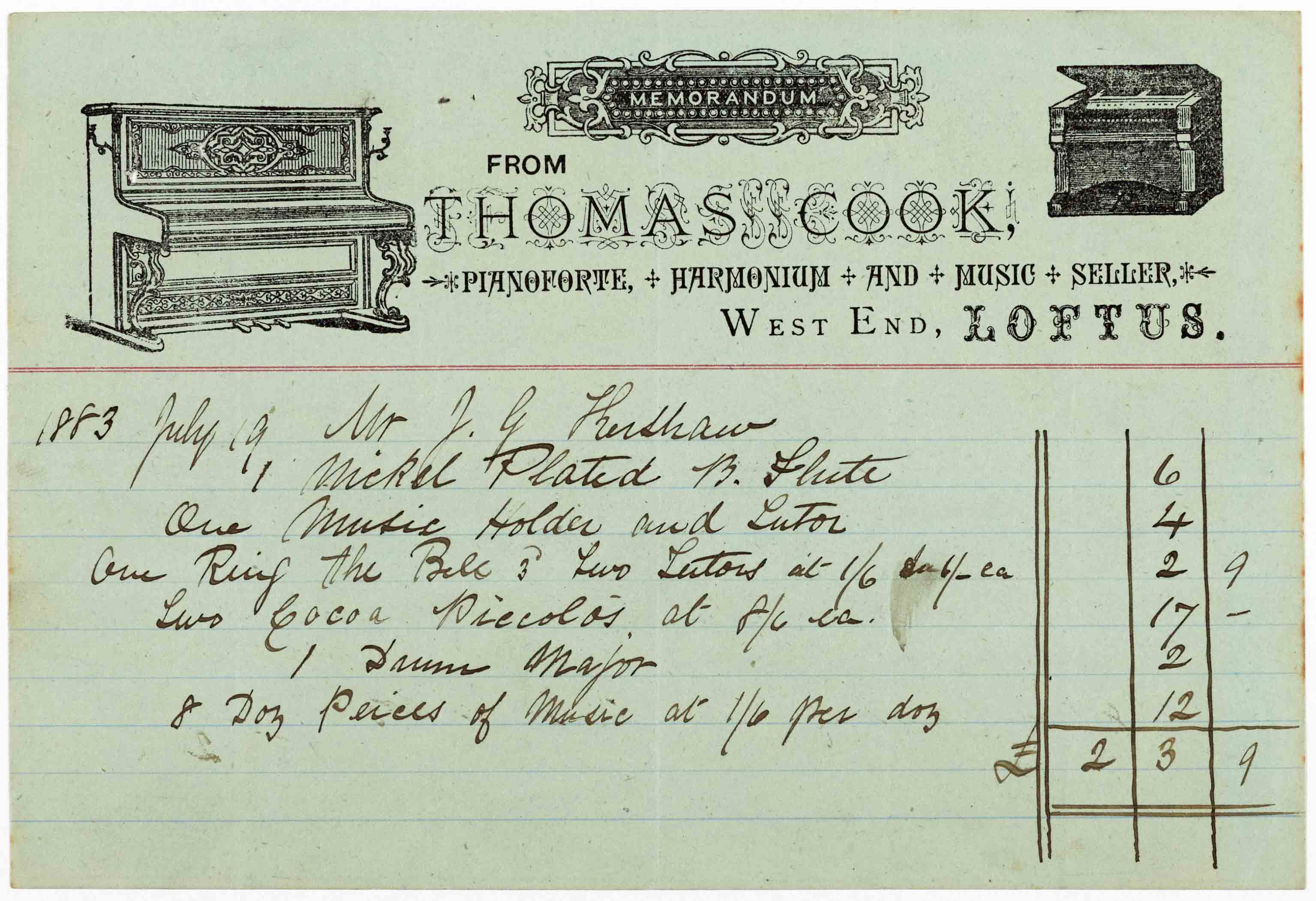 Bill of Thomas Cook, pianoforte, harmonium and music seller at West End, Loftus for goods supplied to J.G. Kershaw on 19 July 1883 [QSB 1884 1/8/11]