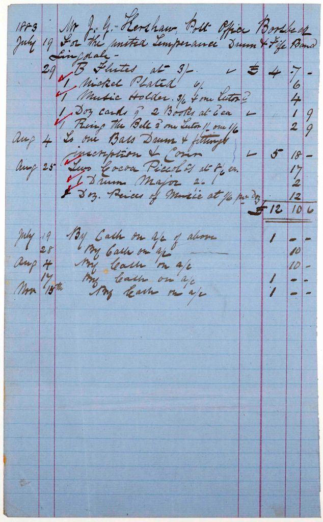 Bill for musical goods supplied to John Kershaw at the Post Office at Boosbeck for the United Temperance Drum and Fife Band at Lingdale in July and August 1883, with payments made on account between July and November 1883 [QSB 1884 1/8/11]