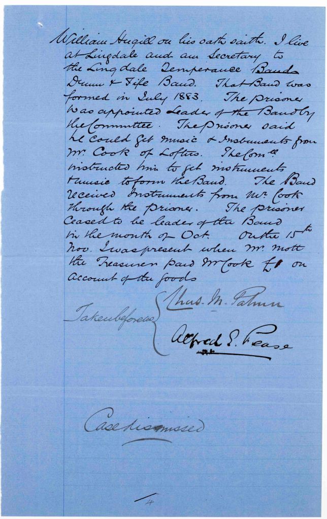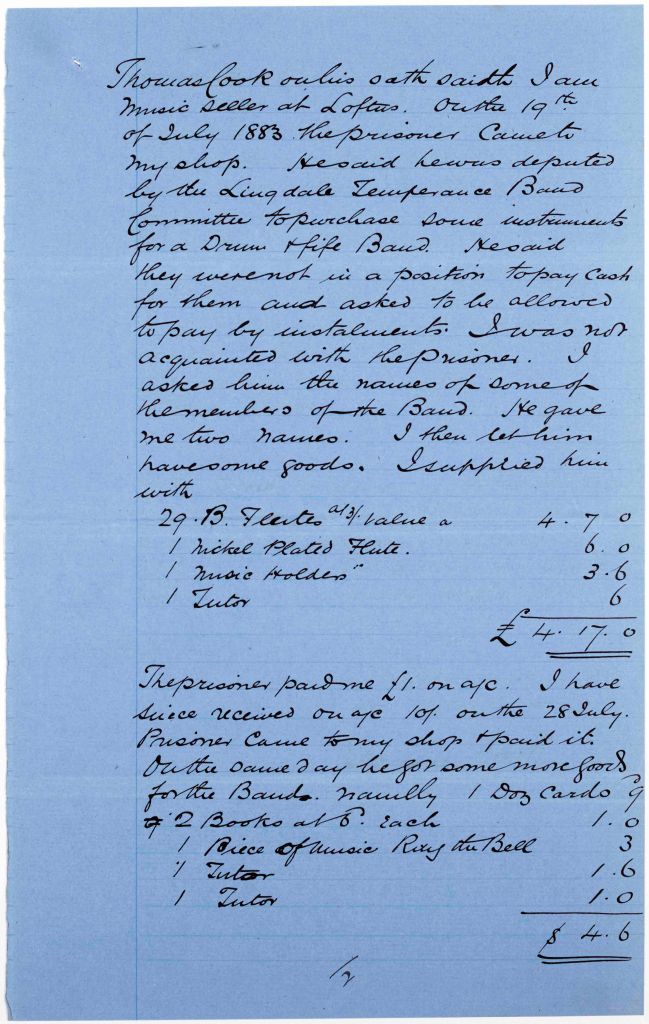 Cover sheet, annotated ‘Dismissed case’ and 4 pages of depositions of Thomas Cook of Loftus, music seller, and William Hugill of Lingdale, witnesses in the case against John George Kershaw for obtaining a nickel plated flute, a music holder, two cocoa piccolos, and a quantity of music from Cook by false pretences, dated 14 December 1883 [QSB 1884 1/8/11]