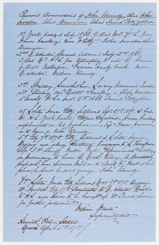Notes dated 4 April 1870 relating to John Kennedy, ‘an incorrigible rogue‘ [QSB 1870 2/9/3]