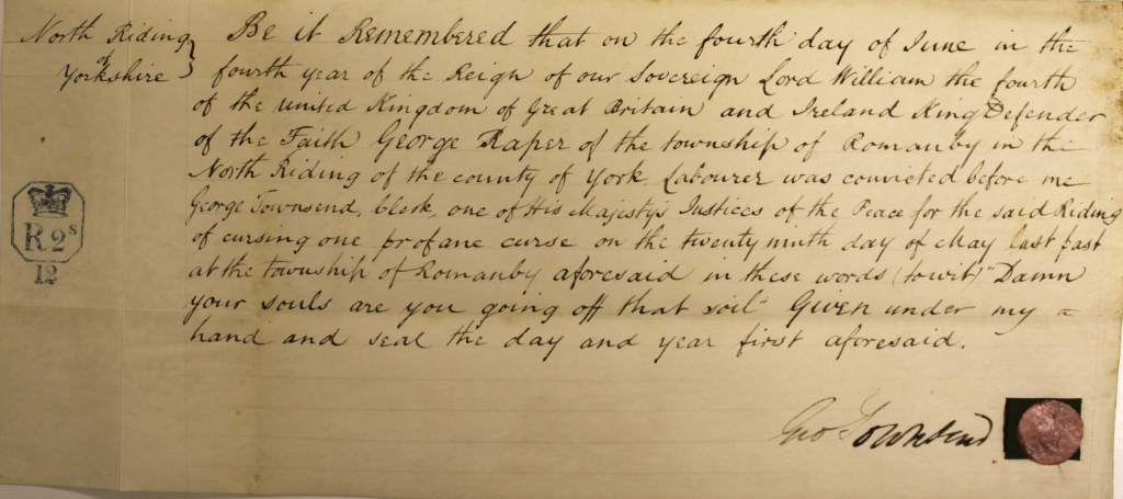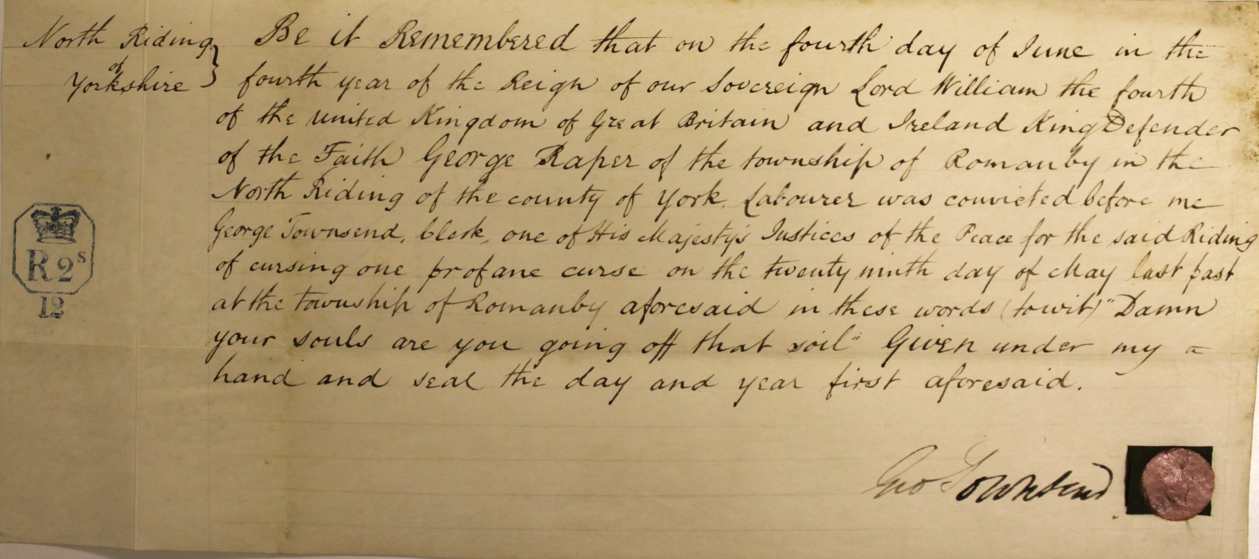 Summary conviction of George Raper of Romanby for using a profane curse, saying ‘Damn your souls, are you going off that soil’, offence committed on 29 May 1834 [QSB 1834 3/10/12]
