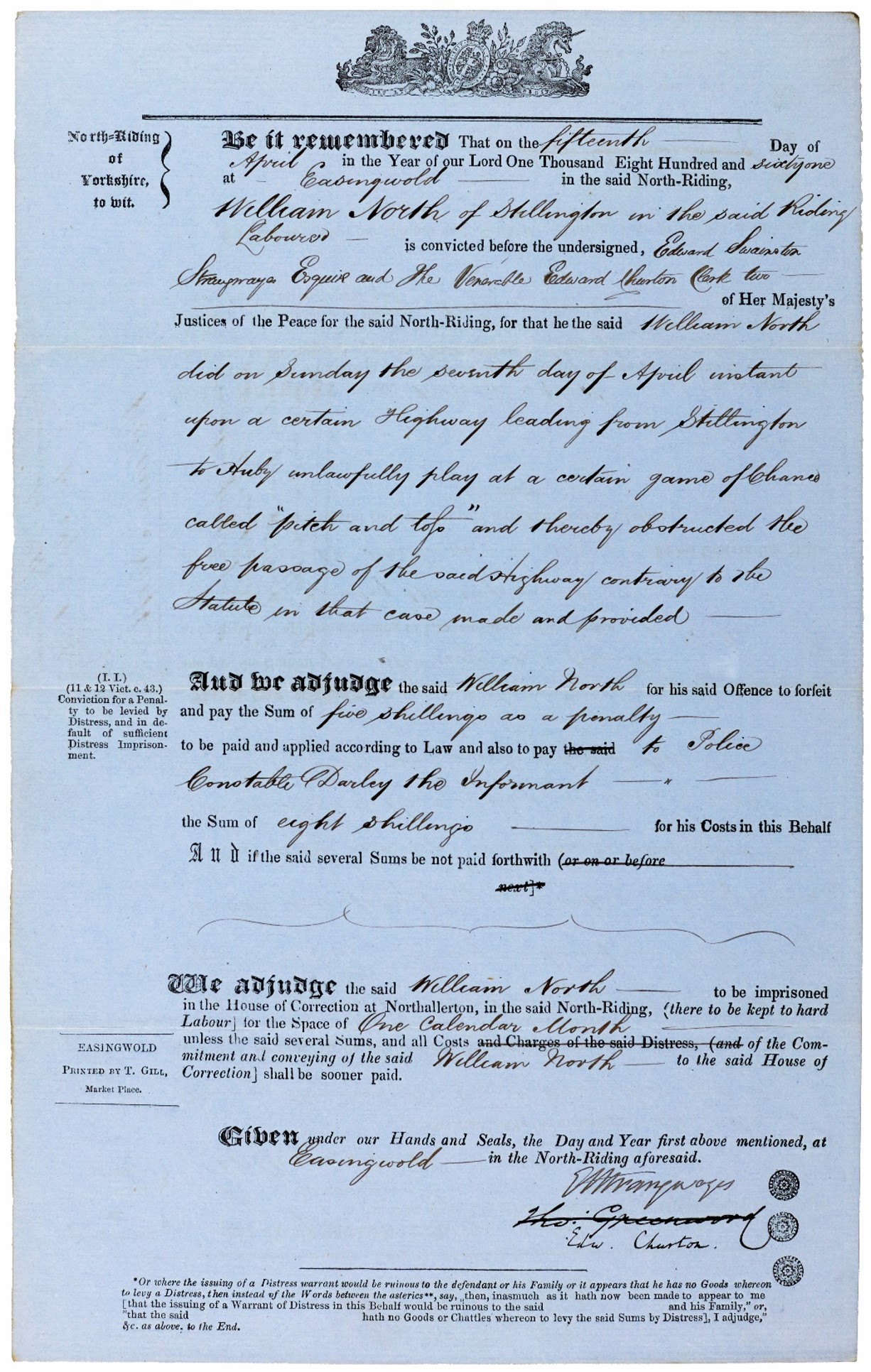 Summary conviction of William North of Stillington for obstructing the highway leading from Stillington to Huby by playing a game of chance called pitch and toss there, offence committed on Sunday 7 April 1861 [QSB 1861 3/10/4/16]