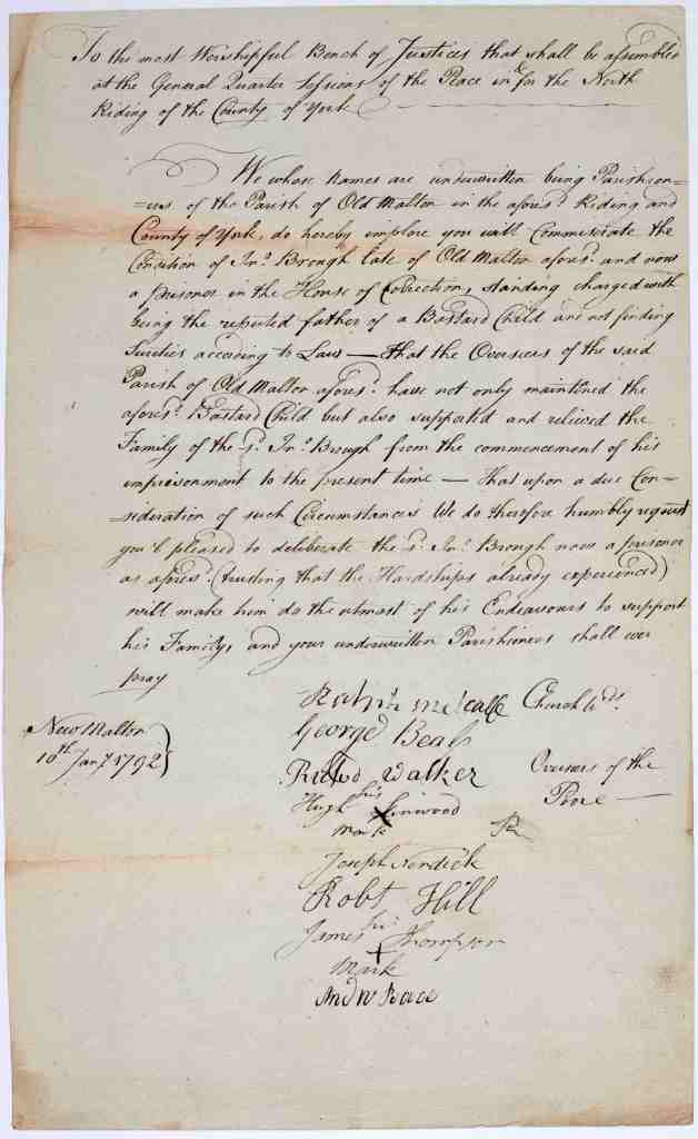 Failure to pay child support had stern penalties. In 1790, John Burgh or Brough was imprisoned in the House of Correction, Northallerton for ‘disobeying an order for the maintenance of the bastard child of Hannah Wardel of Old Malton’.