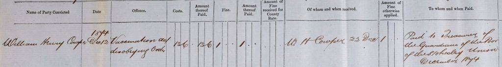 William Henry Cowper of Marton, secretary to the ironworks, was convicted for failing to have his son, Frederic William Cowper, vaccinated and ignoring a previous order to have him vaccinated. He was fined one pound, plus thirteen shillings and sixpence costs. The document below shows he paid the fine immediately [QSB 1875 2/10/9/4].