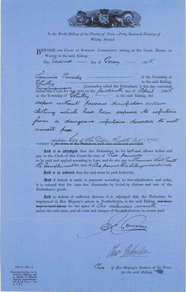 Even the handling of clothing which had been in contact with a smallpox sufferer was regulated. Lavinia Tweedy of Whitby, singlewoman, was convicted for exposing without disinfection clothing which had previously been exposed to infection by smallpox. She was fined two pounds plus costs, with the sum to be raised by seizure and sale of her possessions if she did not pay [QSB 1885 3/10/11/30].