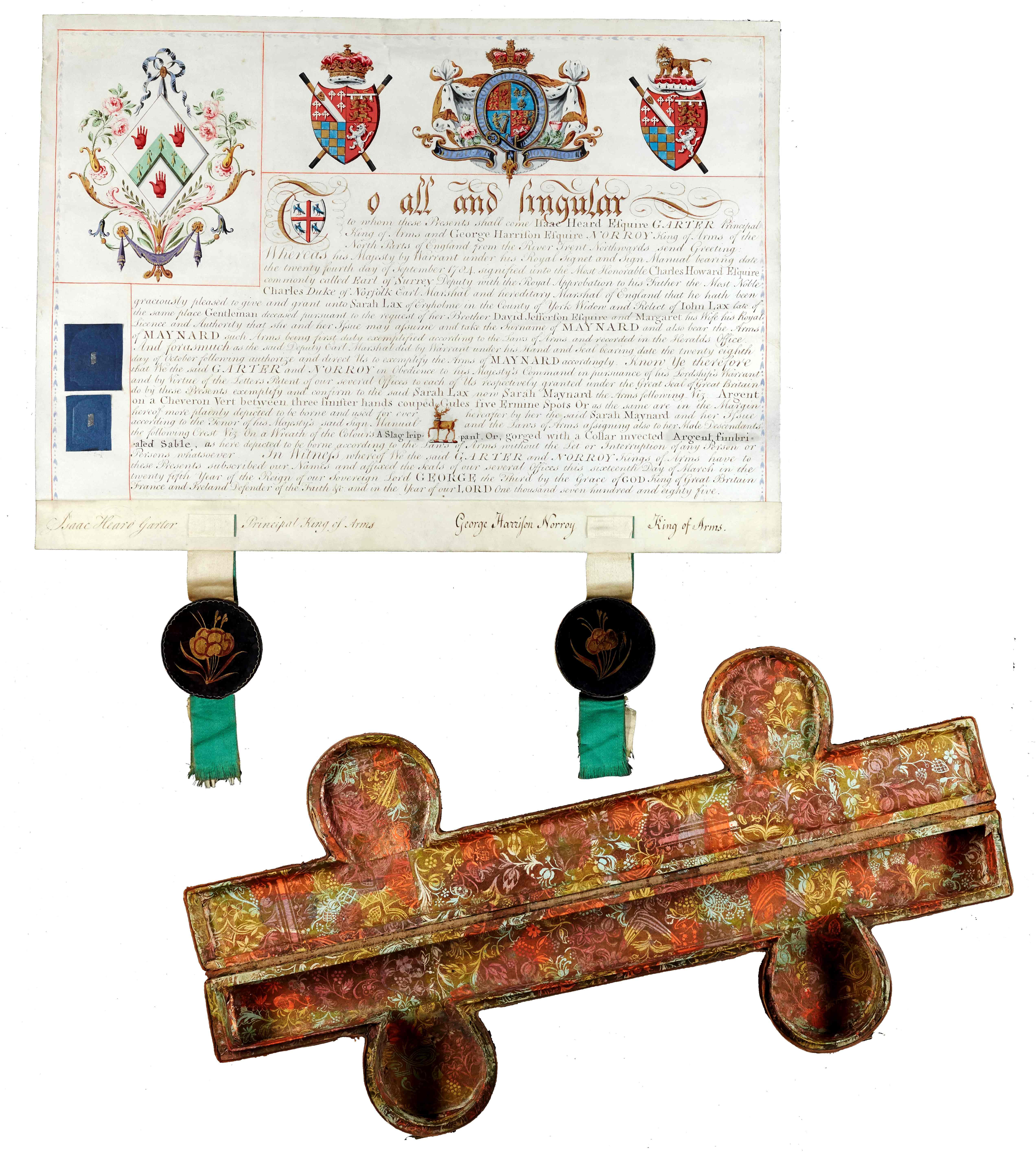 Grant of arms: Maynard – Grant of 1785 allowing Sarah Lax, widow of John Lax of Eryholme, and her heirs, to take the name and bear the arms of Maynard. Sarah was a descendent of John Maynard of Kirklevington. This design features the lozenge shape typically found in female arms [Z.26/1]