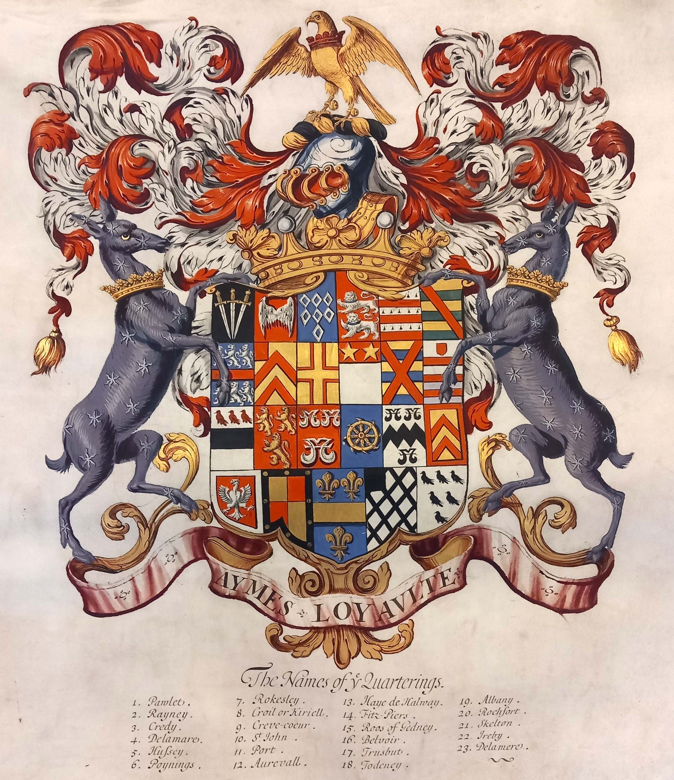 ‘Achievement’ from the Pawlett pedigree: the pedigree of the Pawlett/Paulet family, believed to have been drawn by the College of Heralds [ZBO]
