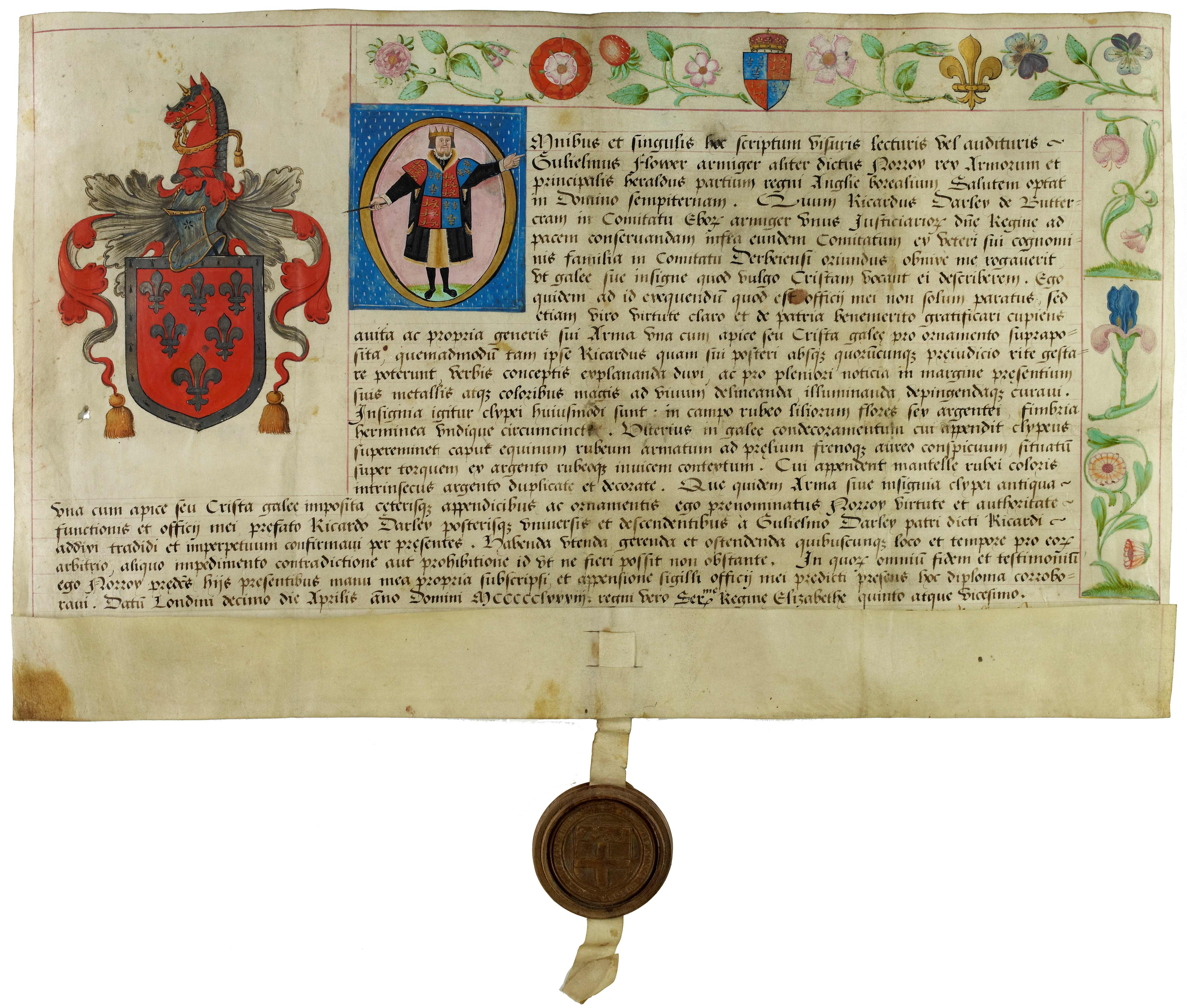 Grant of arms: Darley – Grant to Richard Darley of Buttercrambe in the parish of Bossall, dated 10 April 1583 [ZDA/DAR FP5]
