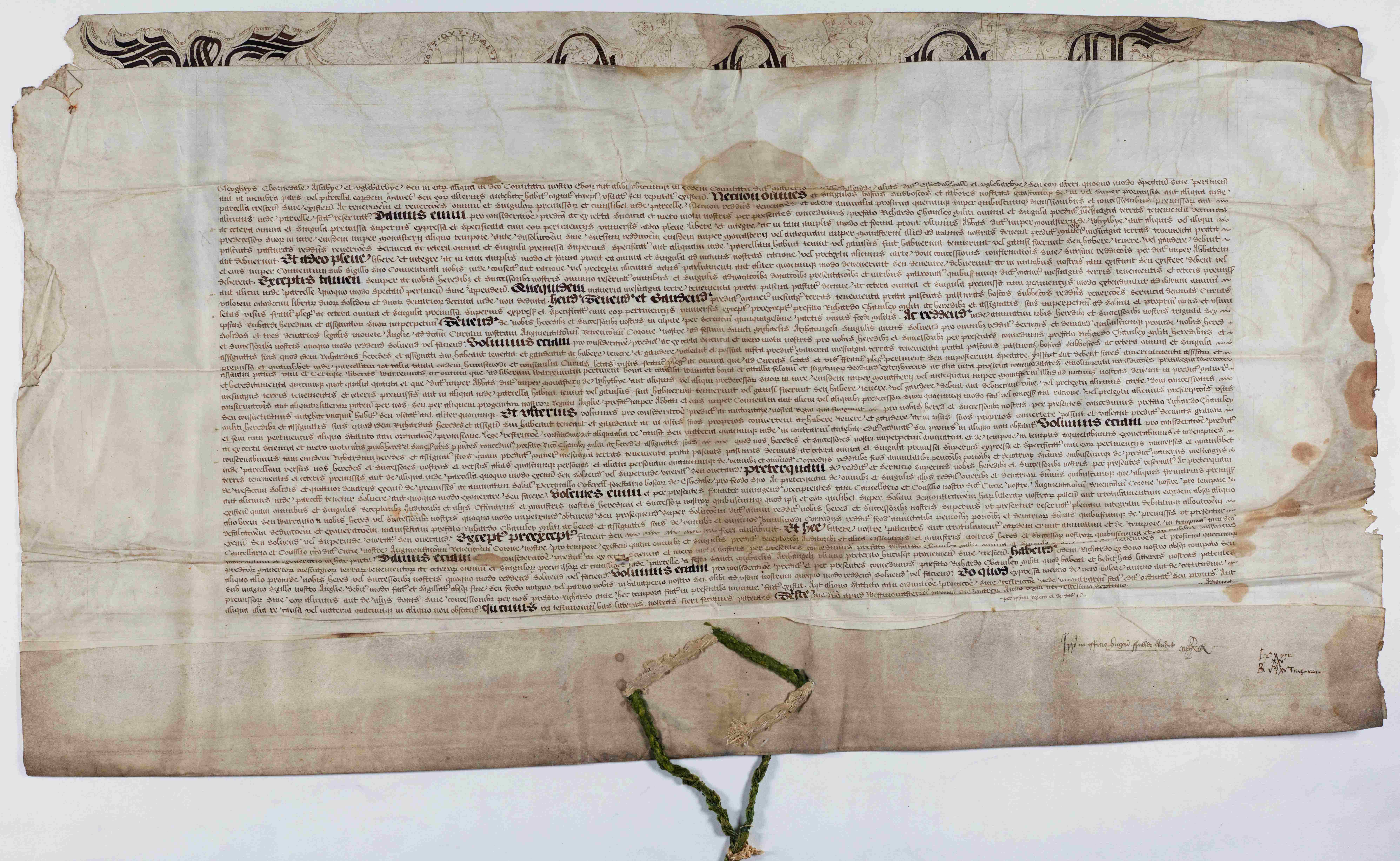 Early charters and letters patent were generally plain and devoid of ornament, apart from in some cases where they were embellished with designs and even illuminated in gold and colour. This was done at the cost of the beneficiaries. Illumination was a practice that picked up in frequency from the fourteenth century.