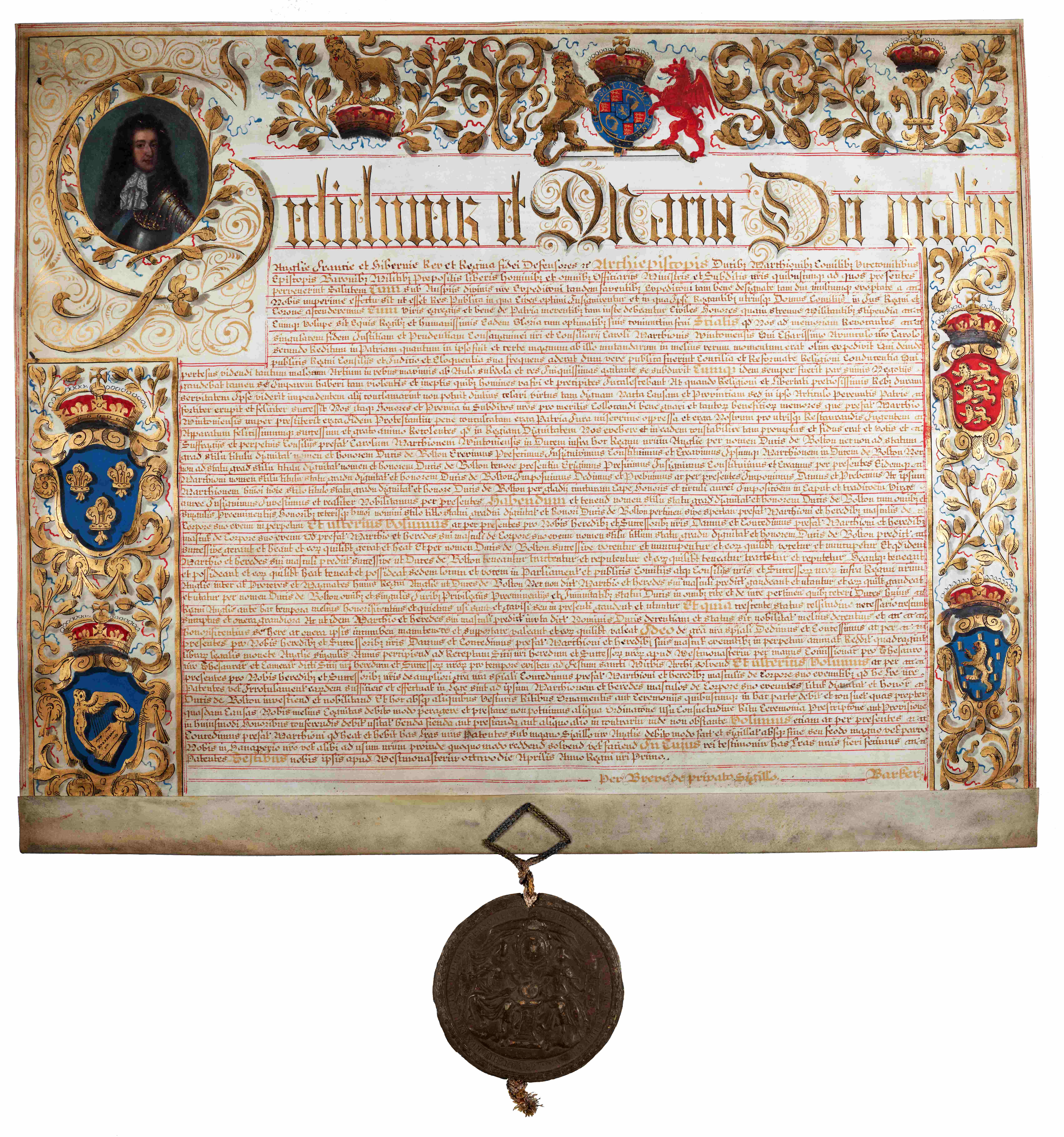 In this letters patent, Charles Powlett, Marquess of Winchester, is made Duke of Bolton by King William after having supported the claim of William and Mary to the throne – and appears to have gone to considerable expense to have the document decorated with heraldry, gilt lions and foliage, and a painted initial portrait of King William [ZBO VIII].