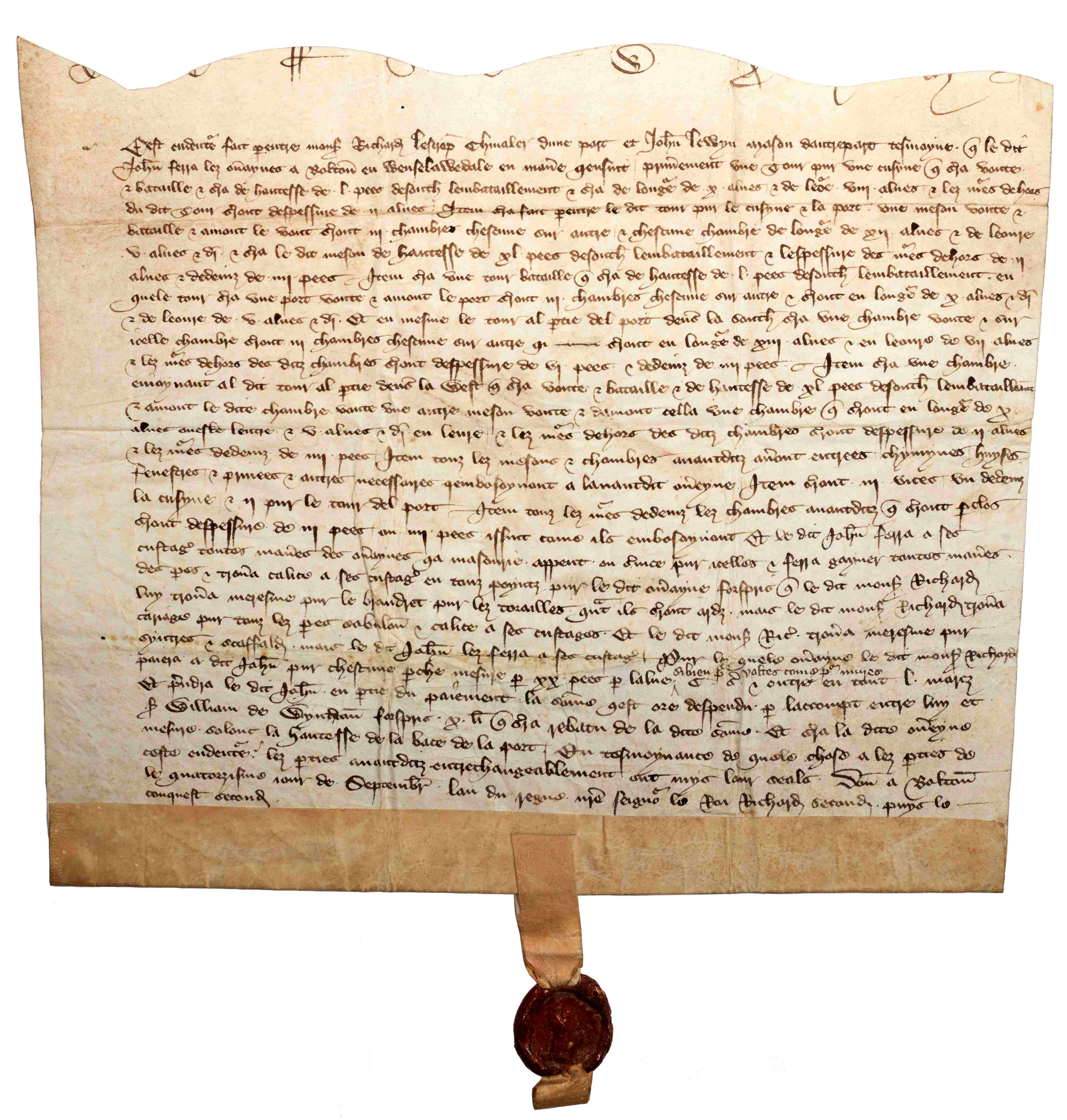 The contract for the building work at Bolton Castle (Castle Bolton, near Leyburn), 1378, between Sir Richard Lescrop and John Lewyn, mason, also survives [ZBO I MD 1]. It contains details of the embattled towers and chambers to be constructed.
