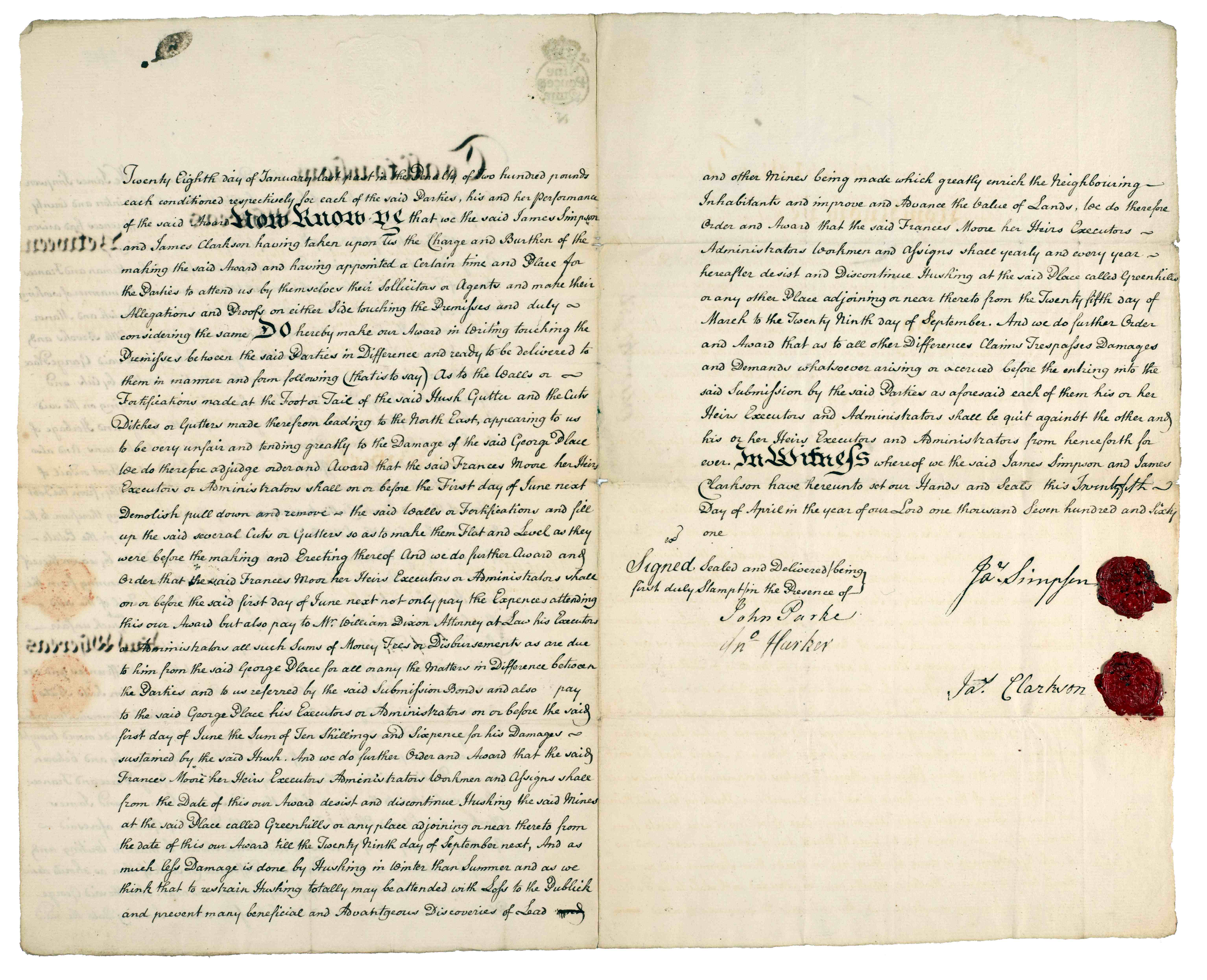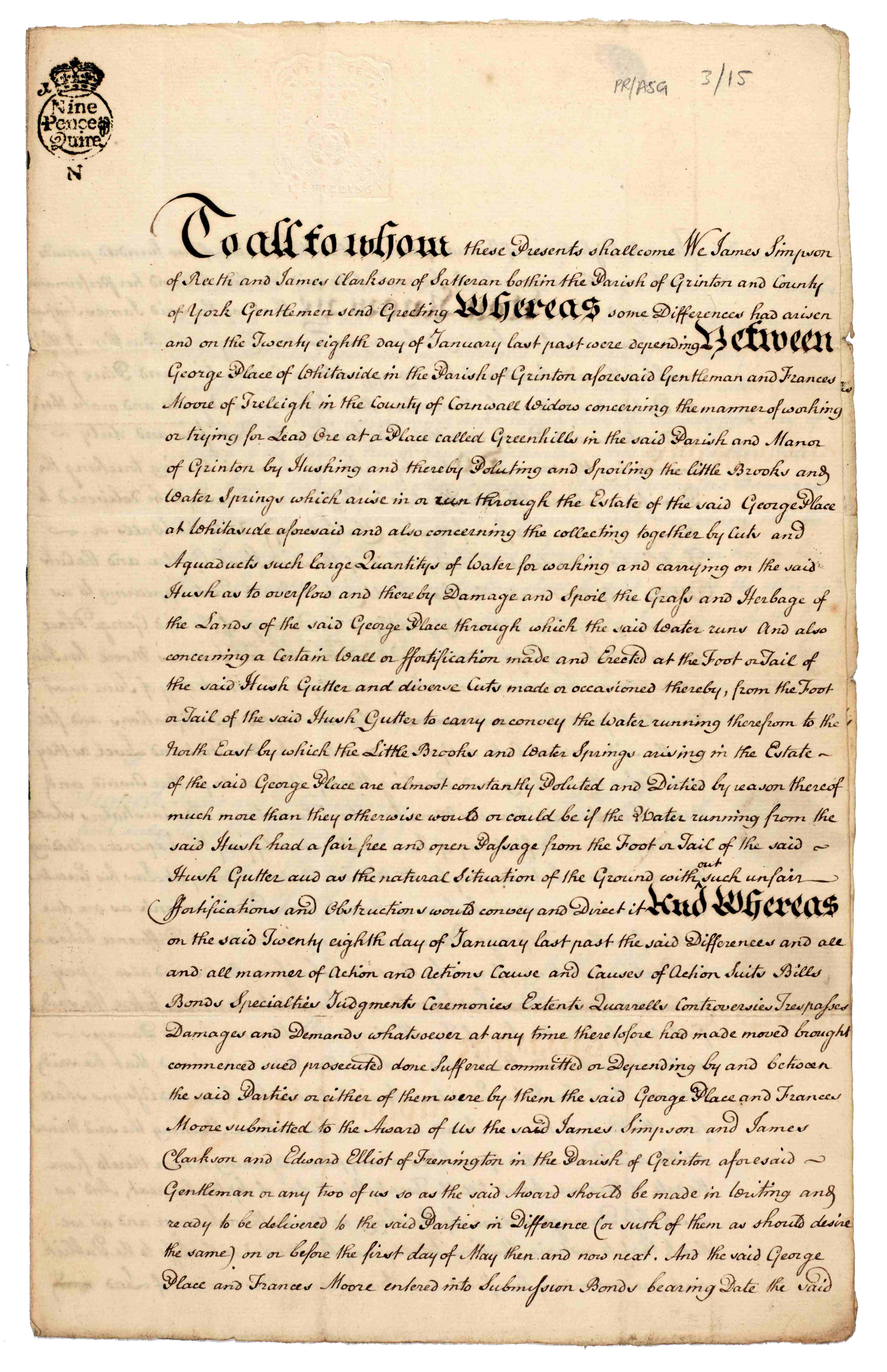 Award in arbitration reciting the dispute between George Place and Francis Moore concerning working of lead ore at Greenhills in Grinton, 25 Apr 1761 [PR/ASG 3/15]