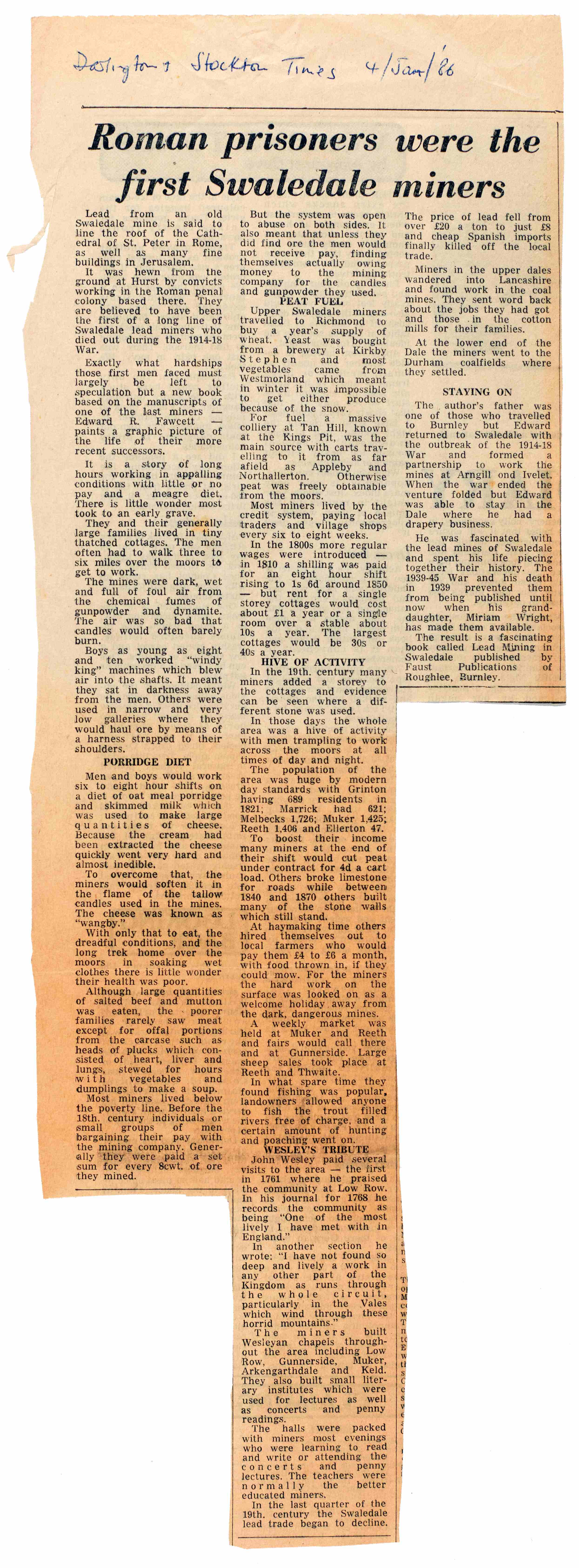 - Left: Newspaper cutting relating to Lead Mining in the Dales from the Stockton and Darlington Times, 4 January 1986 [Z.1296]