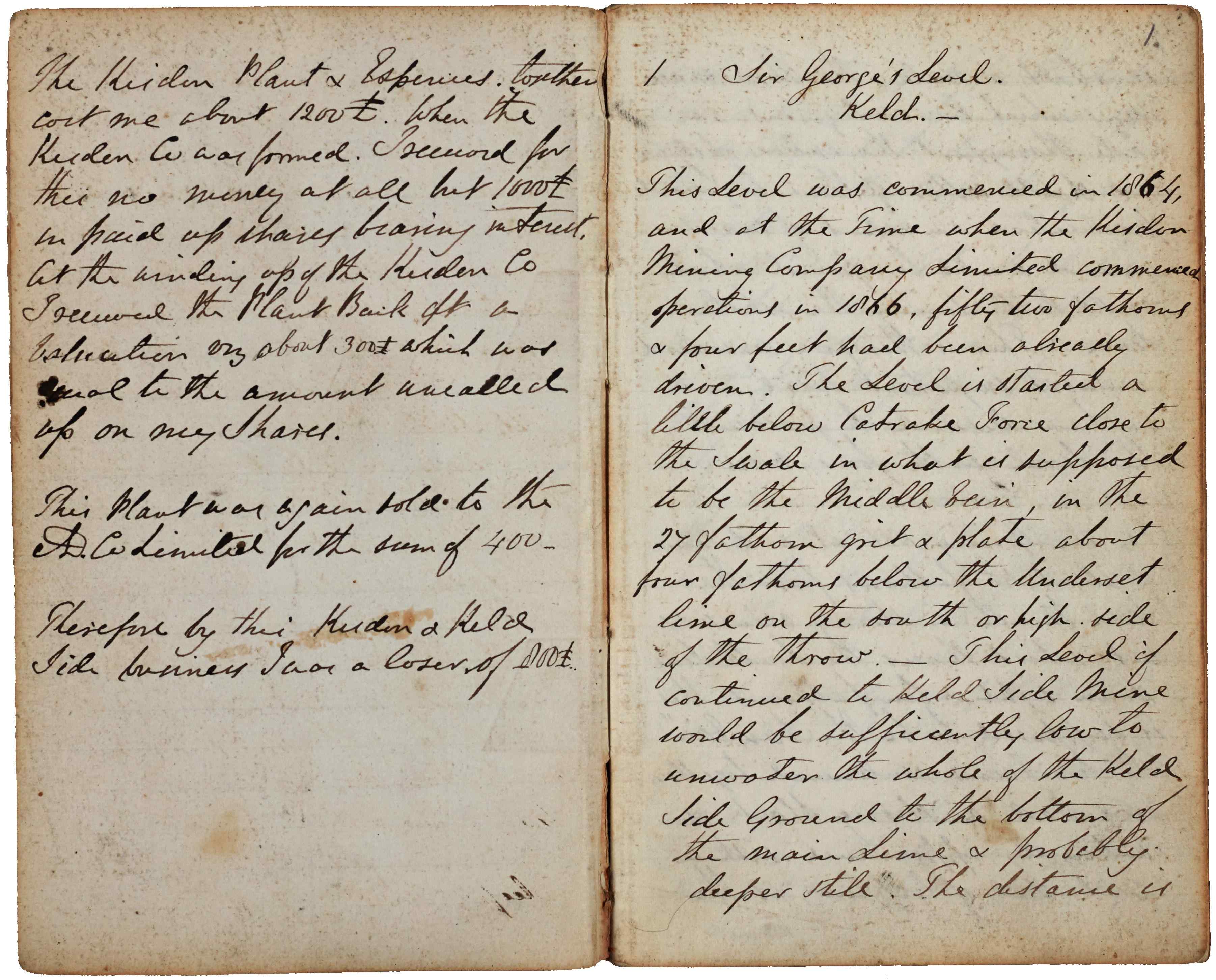 Sir George W. Denys, one of the mineral lords for the north side of Swaledale, kept a detailed notebook of mining activity. He begins by recording the work of the Kisdon Mining Company Limited (1866-1870) in upper Swaledale. He suggests ways of trying the Blakethwaite Vein by reopening Stonesdale Shaft or driving Sir Francis Level up to the West Engine Sump at Blakethwaite Mine. He records his work at Surrender Mine from 1871 until the formation of the A.D. Lead Mining Co. Ltd in 1873. He held a share in the company and continued to record progress undertaken by the company. At Sir Francis Level, he was the first to use compressed air rock drills in a Yorkshire lead mine. He refers to the installation of the Hathorn Davey water-pressure engine in Sir Francis Mine, and the activities of the Old Gang Mining Company, which was struggling to keep going. Sir George died in 1881 and was followed by his son, Sir Francis Denys-Burton, who continued the notebook and added comments to some of his father’s notes, including a note on the inside cover saying “This notebook might prove of great use and should be carefully preserved”. At the rear of the book are more notes about possible deep trials and other likely places where lead might be found