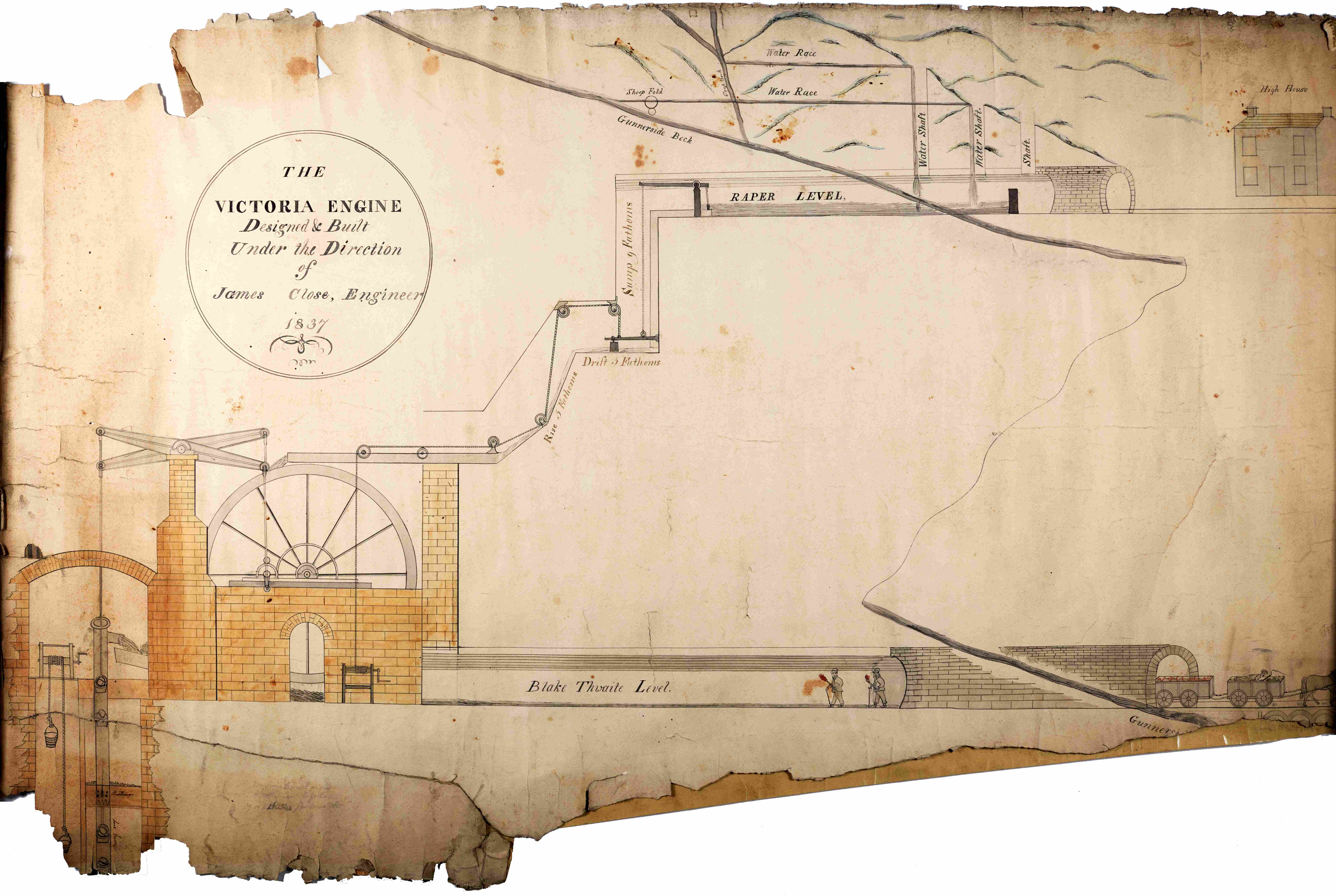 - Right: Plan of ‘Victoria Engine’ water wheel pump, Blakethwaite Mine, Gunnerside, 1837 [Z.1526]