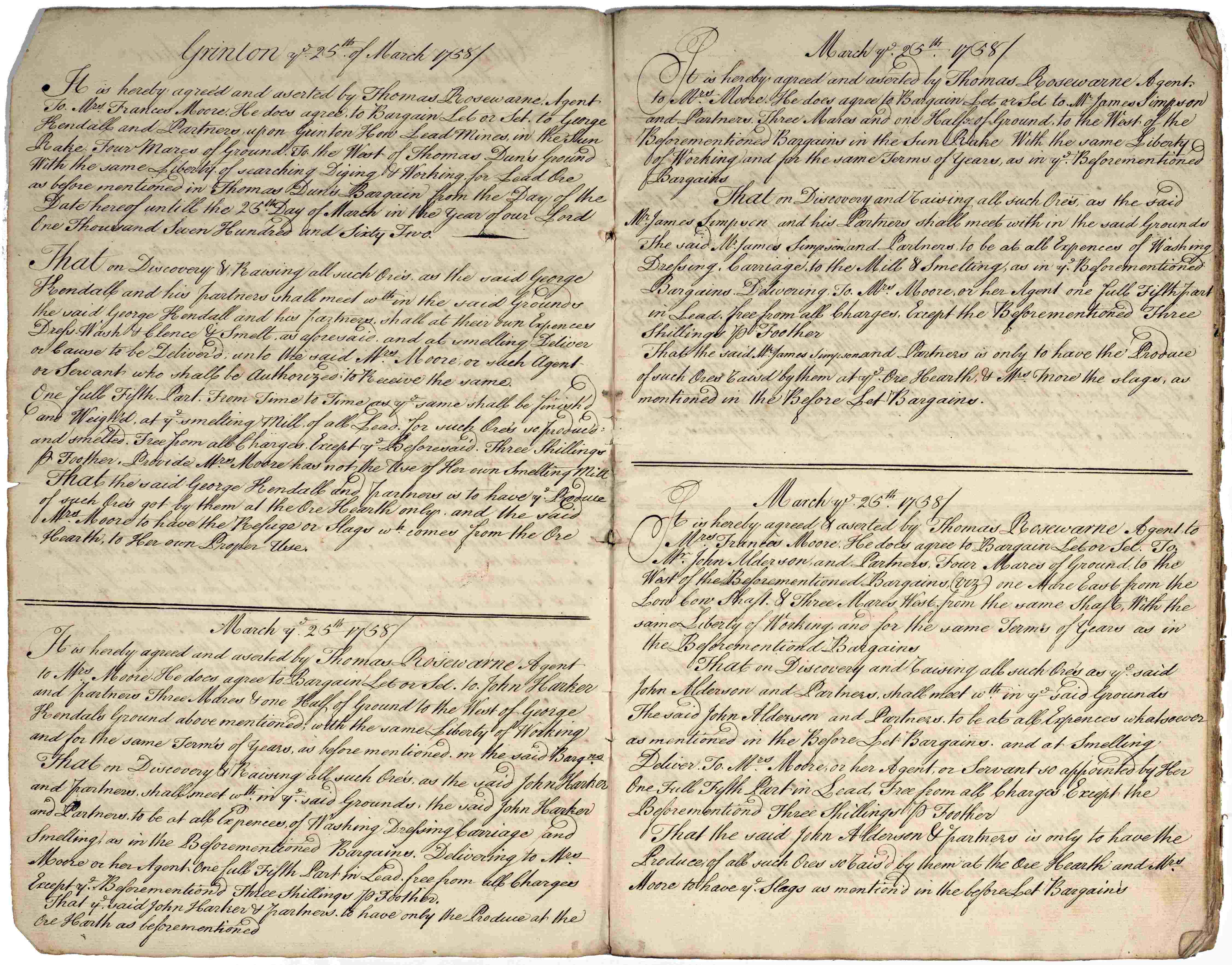 - Centre and right: Bargain book for Grinton How Lead Mines, 1758-1762 [ZKU IX 1/43]