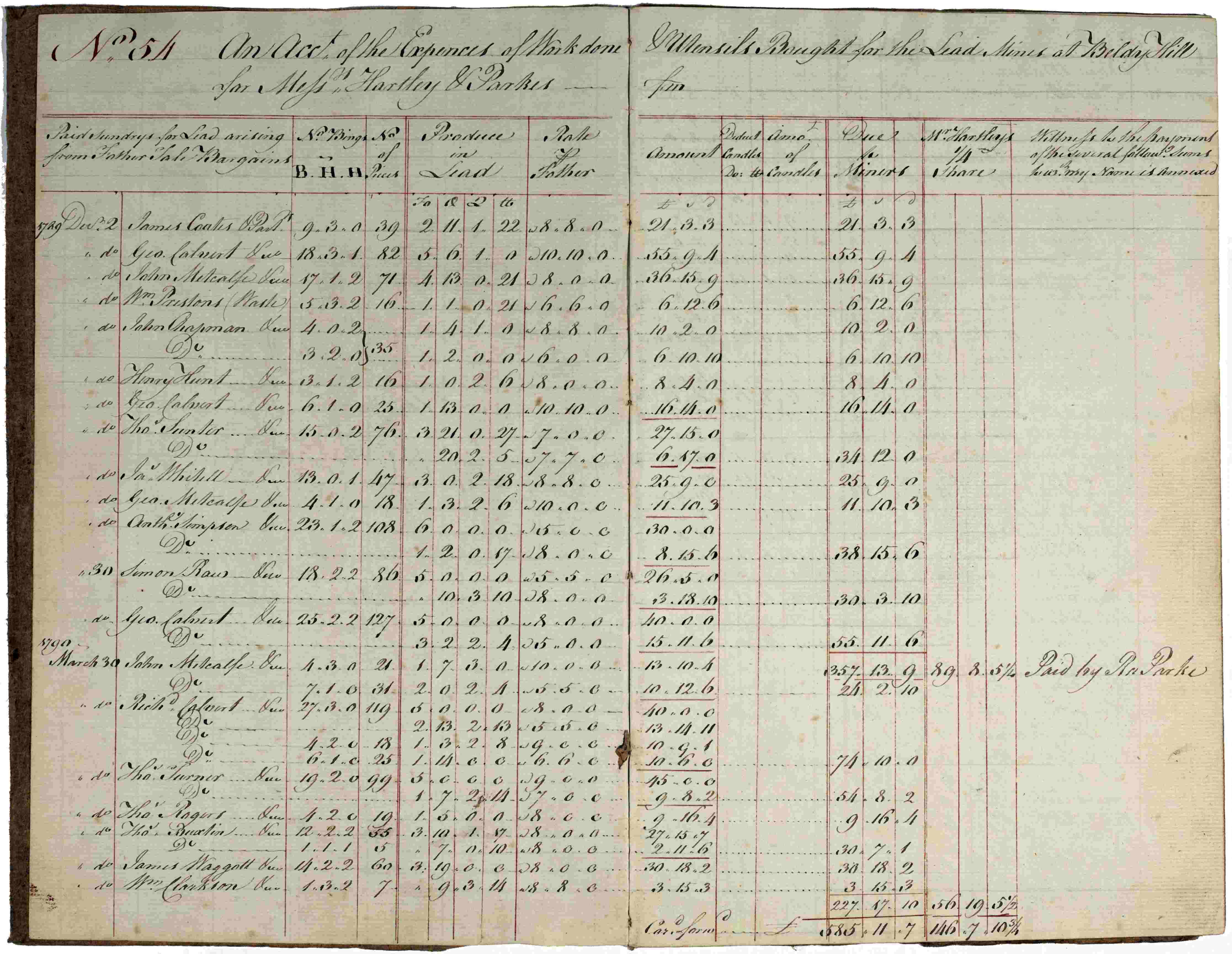 Mining accounts or ‘reckonings’ were agreed at intervals of 12 to 18 months. At West 10 Meers Black Rigg Mine, any costs and any lead produced were divided between the shareholders in ratio to their share. In May 1791-Oct 1792, £1930. 15s. 1½d. was shared between the companies mining agents William Bell (3/7th shares), William Marshall (2/7th shares) and Jacob Bailey (2/7th shares) [Z.1526].