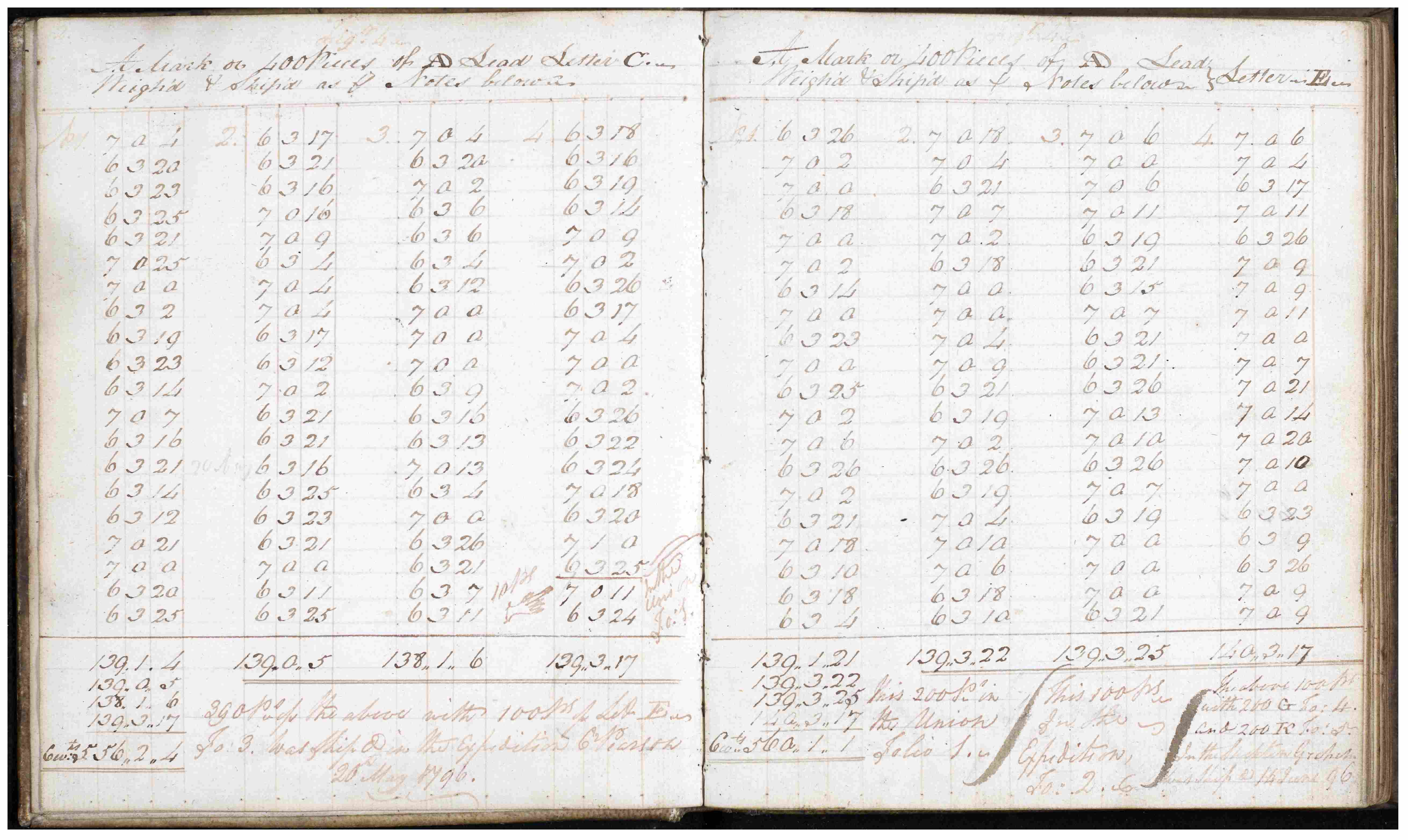 - Left: Matthew Wadeson’s accounts of AD lead weighed and shipped, 1796-1809. Includes notes of who the lead was shipped to and the vessels employed [ZLB 2/1]
