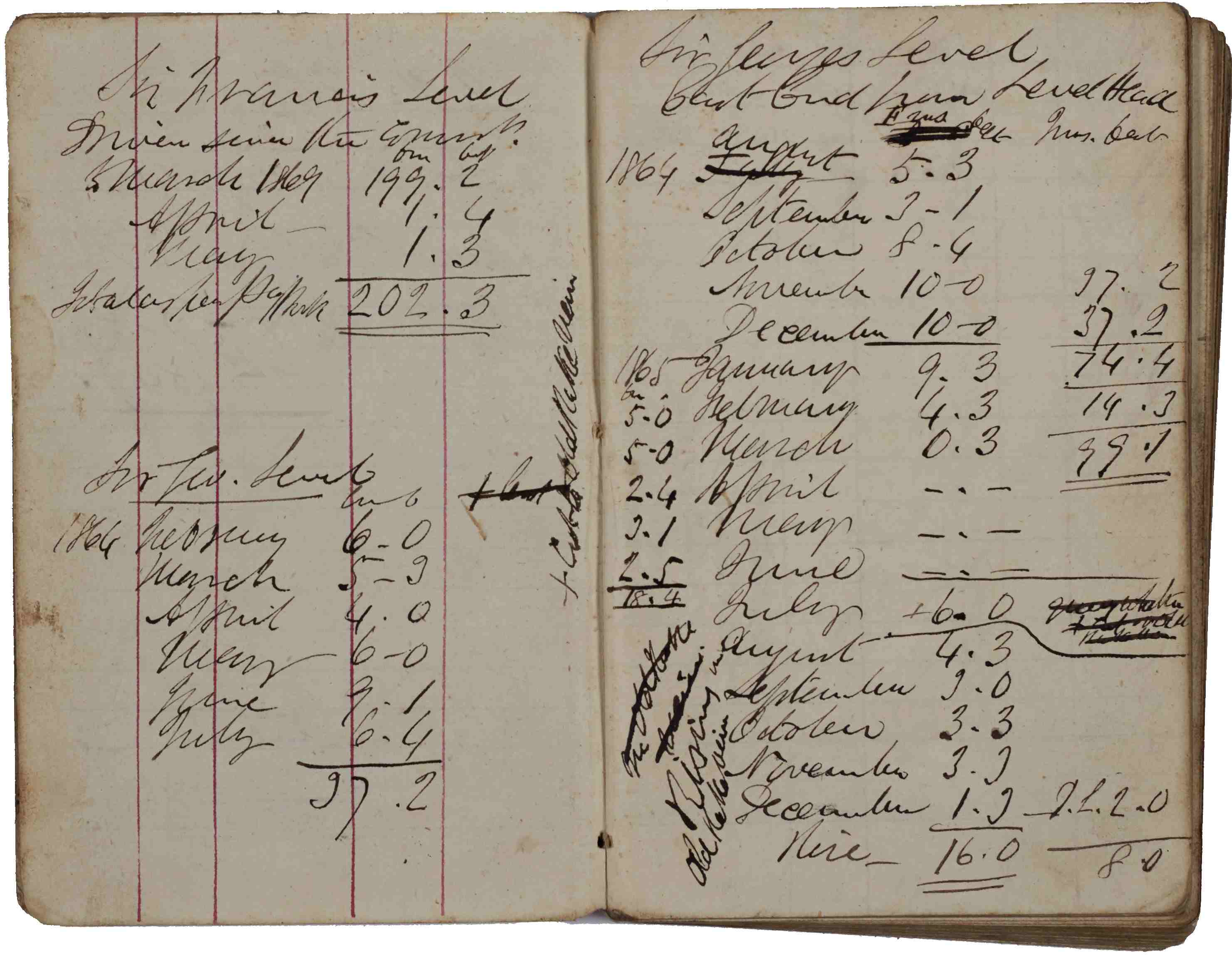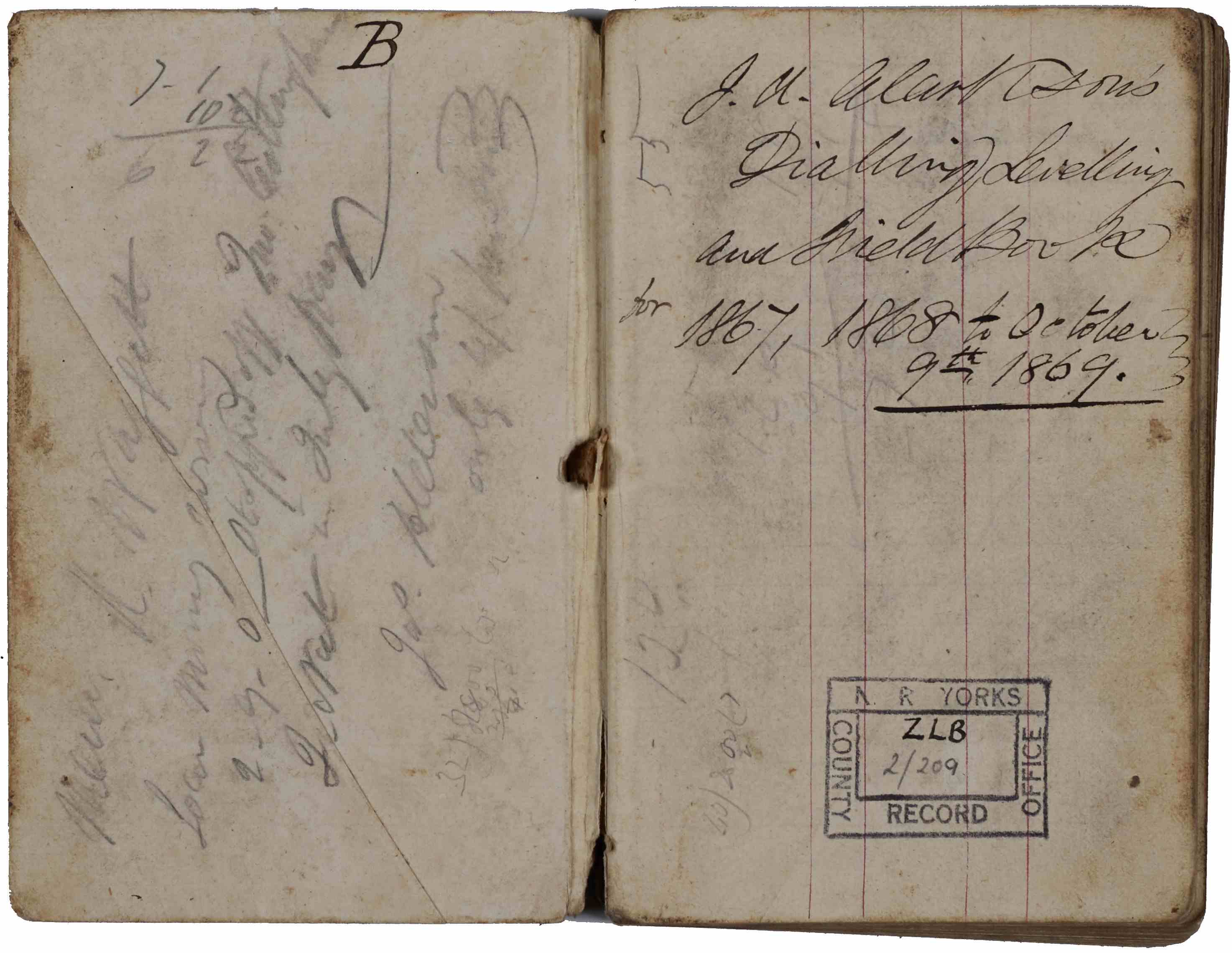 - Left and centre: Dialling book of J.A. Clarkson’s, used as a dialling, levelling and field book for A.D. mines, 1867 [ZLB 2/209]