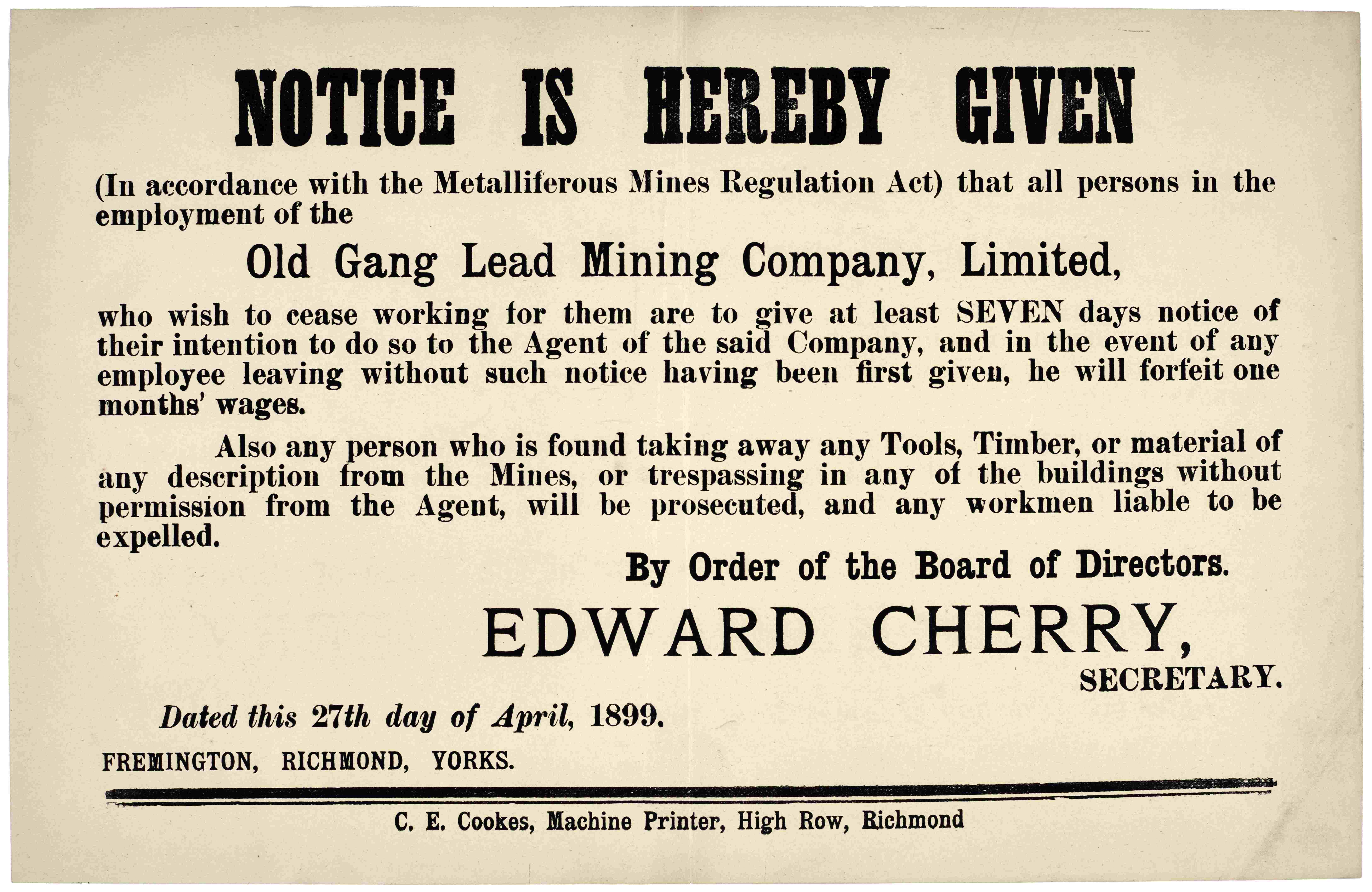 - Right: Notice regarding working conditions at Old Gang Lead Mining Company, 1899 [ZLB 3/34/14]