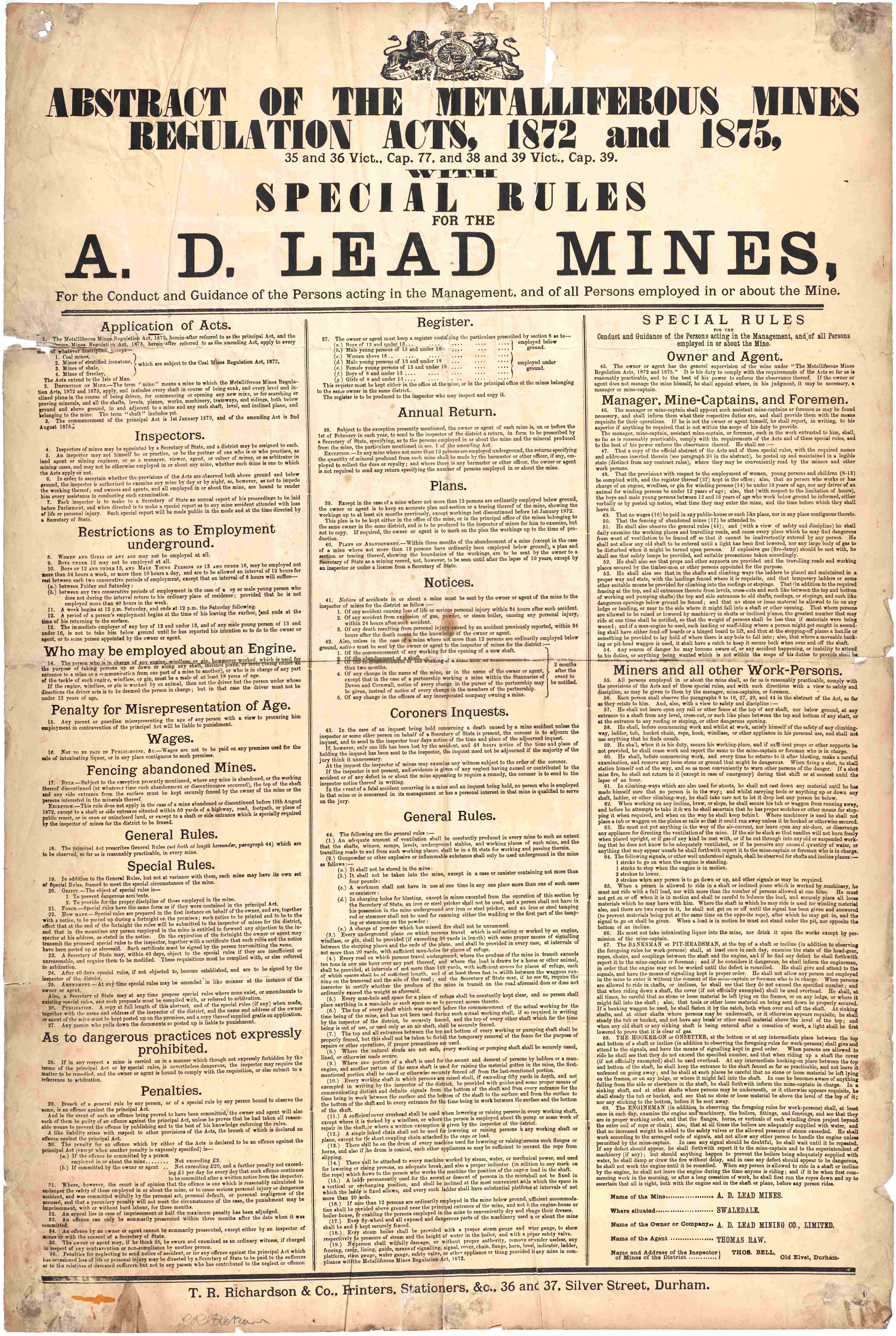- Right: Poster of an Abstract of the Metalliferous Mines Regulations Act with special rules for the A.D. Lead Mines, c.1875 [ZLB 3/34/7]
