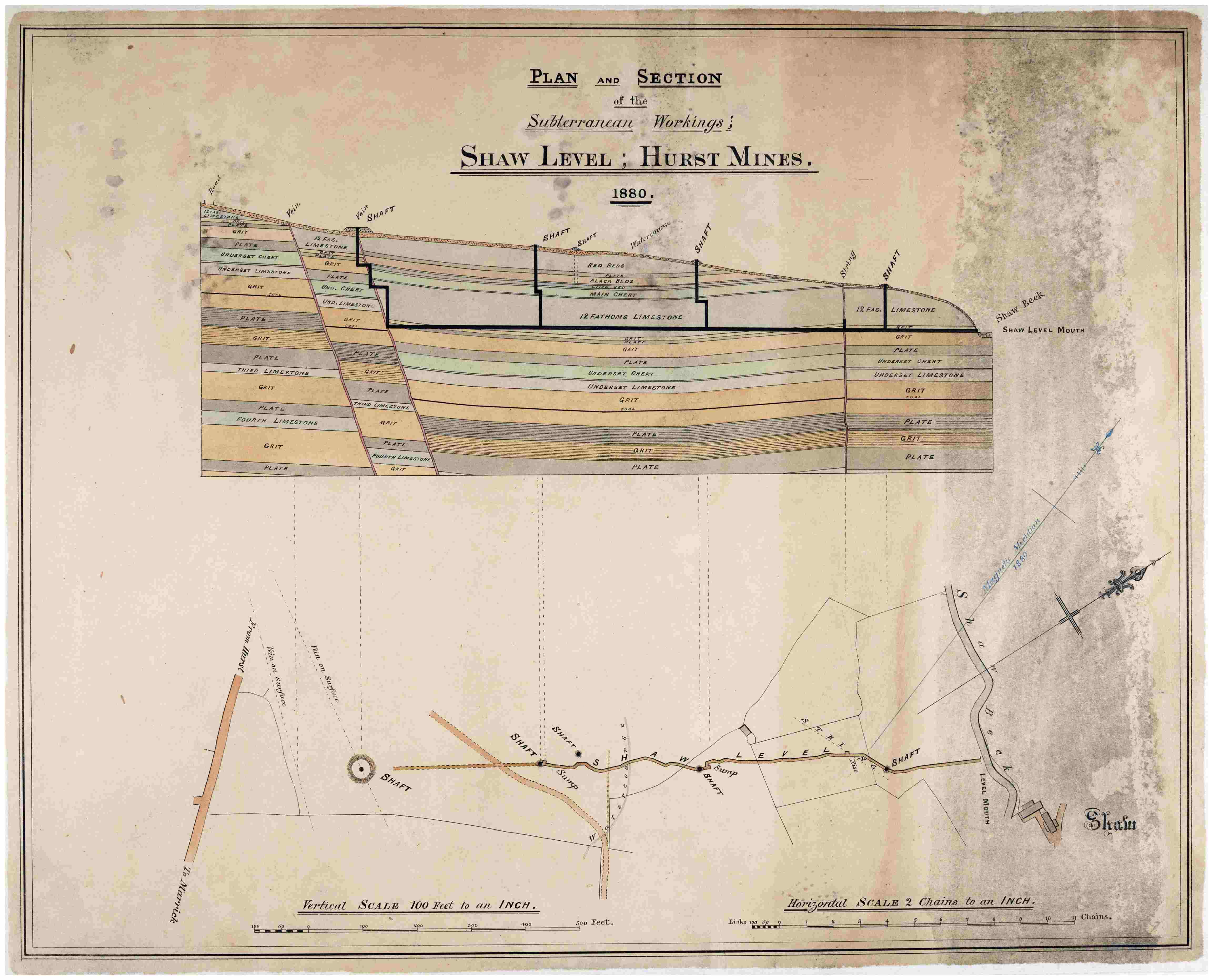 - Left: Plan and sections of the subterranean works of Shaw Level at Hurst Mines, 1880 [ZWX (M) 14]